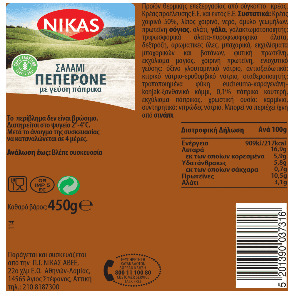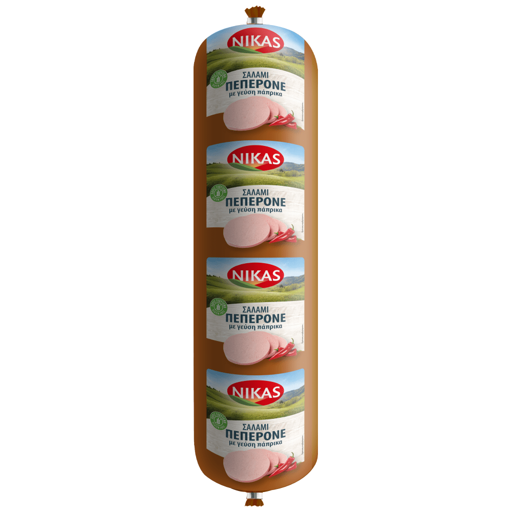 ενισχυτικό γεύσης: όξινο γλουταμινικό νάτριο, αντιοξειδωτικό: κιτρικό νάτριο-ερυθορβικό νάτριο, σταθεροποιητής: τροποποιημένα φύκη eucheuma-καραγενάνη-konjak-ξανθανικό κόμμι, 0,1% πάπρικα καυτερή, εκχύλισμα πάπρικας, χρωστική ουσία: καρμίνιο, συντηρητικό: νιτρώδες νάτριο