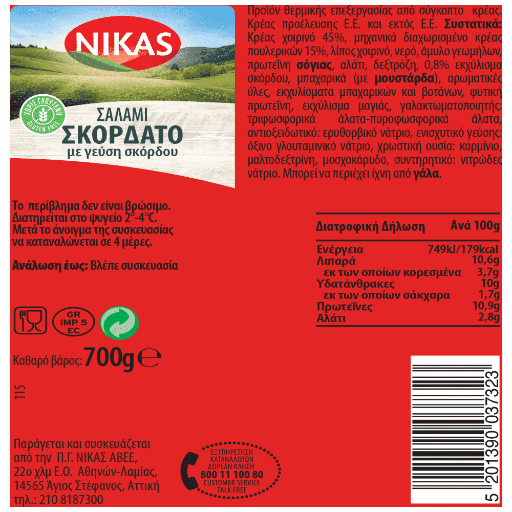 Προϊόν θερμικής επεξεργασίας από σύγκοπτο κρέας Κρέας χοιρινό 45%, μηχανικά διαχωρισμένο κρέας πουλερικών 15%, λίπος χοιρινό, νερό, άμυλο γεωμήλων, πρωτεΐνη σόγιας, αλάτι, δεξτρόζη, 0,8% εκχύλισμα σκόρδου, μπαχαρικά (με μουστάρδα), αρωματικές ύλες, εκχυλίσματα μπαχαρικών και βοτάνων, φυτική πρωτεΐνη, εκχύλισμα μαγιάς, γαλακτωματοποιητής: τριφωσφορικά άλατα-πυροφωσφορικά άλατα, αντιοξειδωτικό: ερυθορβικό νάτριο, ενισχυτικό γεύσης: όξινο γλουταμινικό νάτριο, χρωστική ουσία: καρμίνιο, μαλτοδεξτρίνη, μοσχοκάρυδο, συντηρητικό: νιτρώδες νάτριο. Κρέας προέλευσης Ε.Ε. και εκτός Ε.Ε. Το περίβλημα δεν είναι βρώσιμο.
