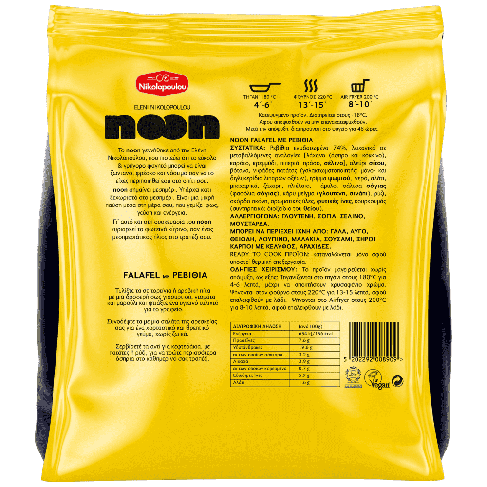 Ρεβίθια ενυδατωμένα 74%, λαχανικά σε μεταβαλλόμενες αναλογίες [λάχανο (άσπρο και κόκκινο), καρότο, κρεμμύδι, πιπεριά, πράσο, σέλινο], αλεύρι σίτου, βότανα, νιφάδες πατάτας (γαλακτωματοποιητής: μόνο- και διγλυκερίδια λιπαρών οξέων), τρίμμα ψωμιού, νερό, αλάτι, μπαχαρικά, ζάχαρη, ηλιέλαιο, άμυλο, σάλτσα σόγιας (φασόλια σόγιας) κάρυ μείγμα (γλουτένη, σινάπι), ρύζι, σκόρδο σκόνη, αρωματικές ύλες, φυτικές ίνες, κουρκουμάς (συντηρητικό: διοξείδιο του θείου).Αλλεργιογόνα