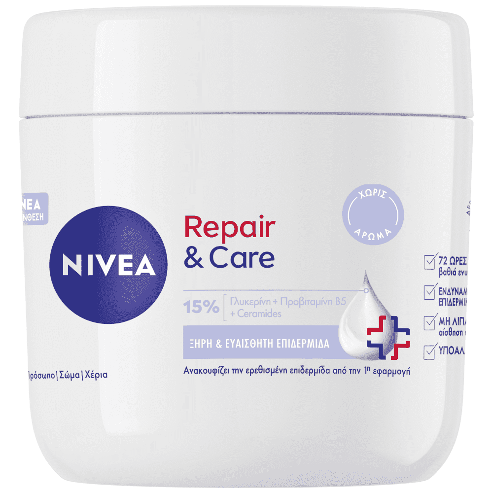 Ψάχνετε μία κρέμα που θα καταπραϋνει την ξηρή ευαίσθητη επιδερμίδας σας; Η NIVEA Repair & Care Cream Χωρίς Άρωμα, με την απαλή της σύνθεση, είναι ιδανική για καταπράυνση και ενυδάτωση από την πρώτη εφαρμογή. Η σύνθεσή της είναι υποαλλεργική και κατάλληλη για όσους αναζητούν ανακούφιση. Κατάλληλη για παιδιά από 3 ετών. Συμβατότητα με την επιδερμίδα δερματολογικά ελεγμένη.