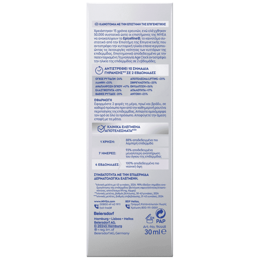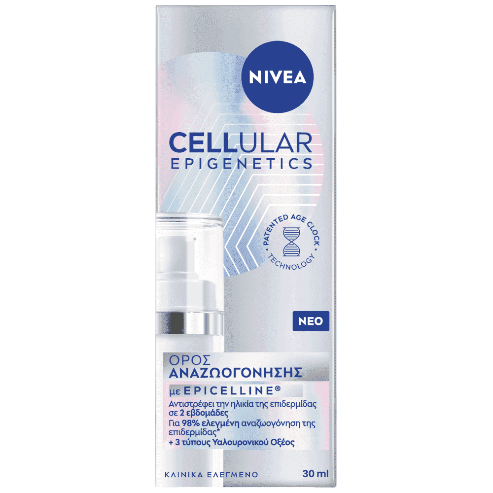 Ορός Αναζωογόνησης με EPICELLINE. Αντιστρέφει την ηλικία της επιδερμίδας σε 2 εβδομάδες. 98% ελεγμένη αναζωογόνηση της επιδερμίδας*. +3 τύπους Υαλουρονικού Οξέος. Το καινοτόμο συστατικό EPICELLINE από την Επιστήμη της Επιγενετικής αντιστρέφει την κυτταρική ηλικία επανενεργοποιώντας τις λειτουργίες νεότητας των κυττάρων της επιδερμίδας. Επιστημονικά αποδεδειγμένο με την πατενταρισμένη τεχνολογία Age Clock αντιστρέφει την ηλικία της επιδερμίδας σε 2 εβδομάδες. Αντιστρέφει 10 Σημάδια Γήρανσης** σε 2 βδομάδες. Όγκος ρυτίδων -24% Λάμψη +20% Αναπλήρωση όγκου +47% Εκαστικότητα +20% Βαθιές ρυτίδες -20% Αποτέλεσμα Lifting +20% Σφριγηλότητα +20% Ενυδάτωση +36% Απαλότητα +17% Αντοχή +25%