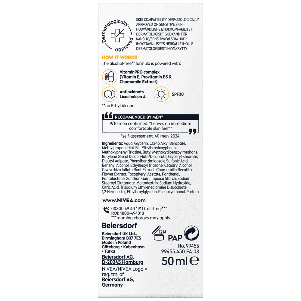 Η ενυδατική κρέμα προσώπου NIVEA MEN Sensitive Daily Protect Moisturiser παρέχει προηγμένη φροντίδα για το ευαίσθητο δέρμα με μια σύνθεση τριπλής προστασίας. Εμπλουτισμένη με το σύμπλεγμα VitaminPRO (Βιταμίνη Ε και Προ βιταμίνη Β5) και αντιοξειδωτικά, η ελαφριά και γρήγορα απορροφούμενη ενυδατική κρέμα προστατεύει την επιδερμίδα σας από τις ακτινοβολίες UVA/UVB, την επίδραση του μπλε φωτός και τη ρύπανση. Η μη λιπαρή σύνθεσή της προσφέρει άμεση ενίσχυση της ενυδάτωσης, αφήνοντας την επιδερμίδα σας ενυδατωμένη και με υγιή όψη όλη την ημέρα. Ειδικά σχεδιασμένη για ευαίσθητες επιδερμίδες, είναι δερματολογικά ελεγμένη και μπορεί επίσης να χρησιμοποιηθεί μετά το ξύρισμα για πρόσθετη προστασία. Εφαρμόστε καθημερινά σε καθαρό πρόσωπο και λαιμό για πιο δυνατή, πιο ανθεκτική επιδερμίδα με άνεση που διαρκεί.