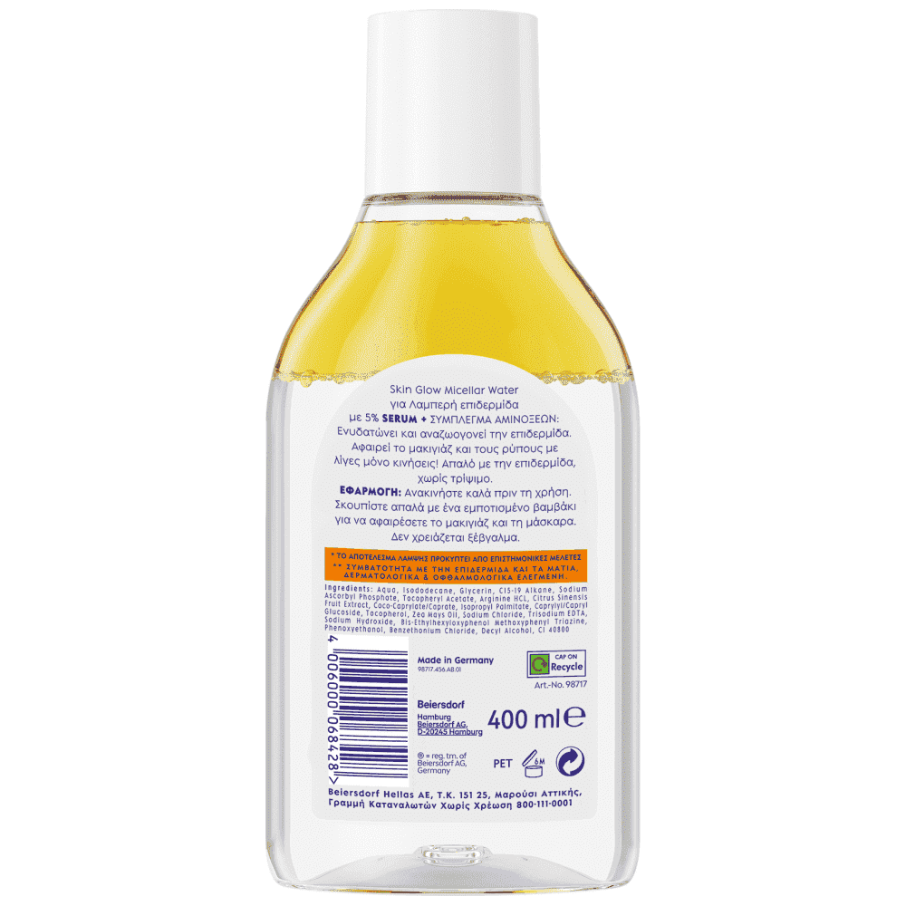 Skin Glow Micellar Water για λαμπερή επιδερμίδα με 5% SERUM και σύμπλεγμα αμινοξέων: Ενυδατώνει και αναζωογονεί την επιδερμίδα. Αφαιρεί το μακιγιάζ και τους ρύπους με λίγες μόνο κινήσεις. Απαλό με την επιδερμίδα χωρίς τρίψιμο.