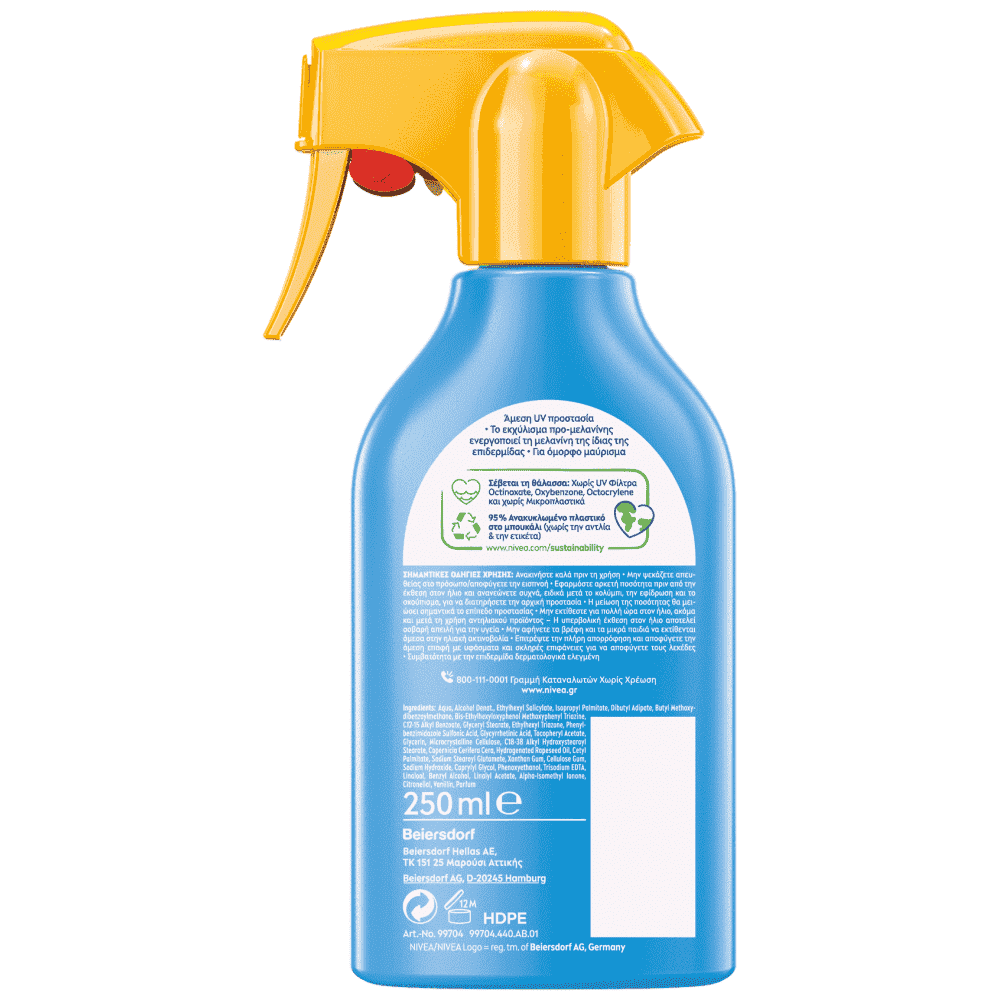 Το NIVEA SUN Protect & Bronze Trigger Spray παρέχει Διπλή δράση: άμεση προστασία από την υπεριώδη ακτινοβολία για την επιδερμίδα σας και φυσικό μαύρισμα χάρη στο εκχύλισμα προ-μελανίνης που ενισχύει τη μελανίνη της επιδερμίδας. Για όμορφο και υγιές μαύρισμα. Η μη λιπαρή σύνθεση είναι αδιάβροχη & χωρίς αυτομαυριστικές ιδιότητες. Η σύνθεσή του σέβεται τη θάλασσα καθώς είναι απαλλαγμένη από φίλτρα UV Octinoxate, Oxybenzone, Octocrylene & είναι χωρίς Μικροπλαστικά.