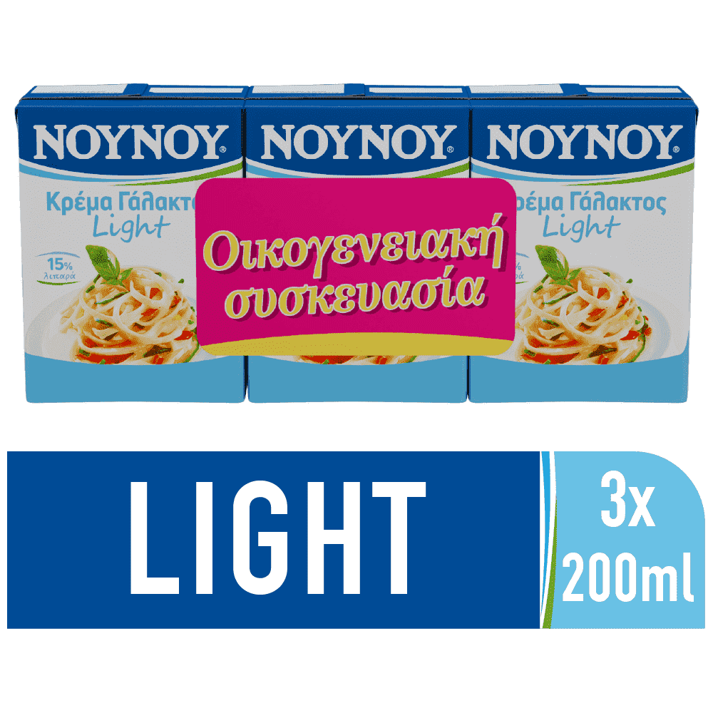 Η κρέμα γάλακτος ΝΟΥΝΟΥ Light είναι ο φυσικός σύμμαχος για λαχταριστή, ελαφριά κουζίνα, διασφαλίζοντας πάντα ένα άψογο μαγειρικό αποτέλεσμα. Συνοδεύει γρήγορα, εύκολα και απλά τα καθημερινά μας γεύματα, δένοντας με τα υλικά κάθε συνταγής χωρίς να τα επισκιάζει, προσφέροντας ξεχωριστή ανάλαφρη απόλαυση. Παράγεται από αγνό αγελαδινό γάλα στο πρότυπο εργοστάσιο ΝΟΥΝΟΥ Πάτρας.