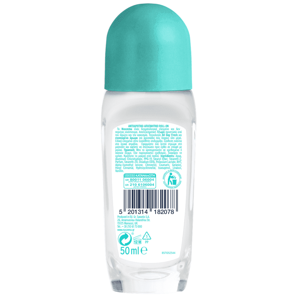 To γυναικείο αντιιδρωτικό Αποσμητικό Rollon Noxzema Fresh Blossom, προσφέρει αποτελεσματική 72ωρη προστασία από τον ιδρώτα και την κακοσμία, είναι ειδικά ελεγμένο για την ευαίσθητη επιδερμίδα, ενώ χάρη στην πρωτοποριακή τεχνολογία All Day Fresh και το ενισχυμένο άρωμα με τις επιλεγμένες αρωματικές νότες, χαρίζει υπέροχη λουλουδένια φρεσκάδα μεγάλης διάρκειας. Διαθέτει κλινικά αποδεδειγμένη απαλότητα και χαρίζει σιγουριά και αυτοπεποίθηση όταν τη χρειάζεστε!Είναι δερματολογικά ελεγμένο, φιλικό με την επιδερμίδα, έχει υπέροχο λουλουδένιο άρωμα και δεν περιέχει οινόπνευμα.