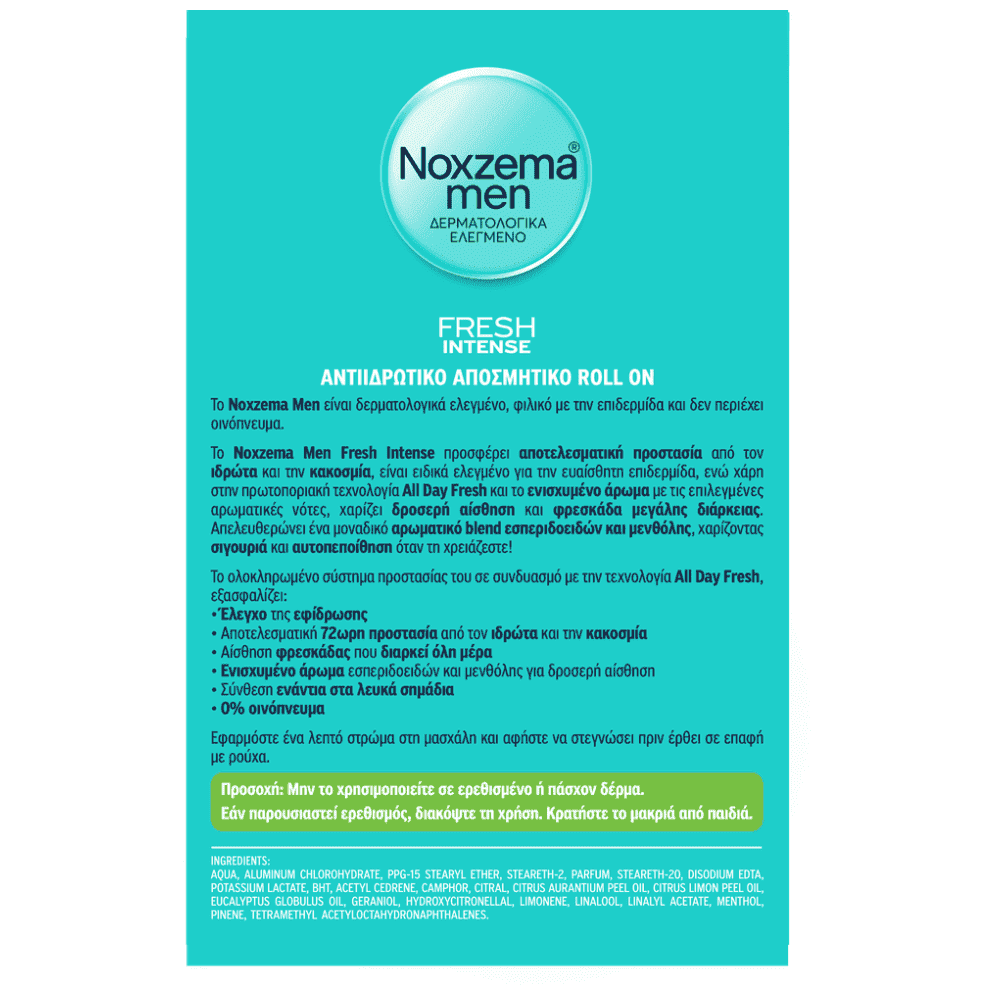 To ανδρικό αντιιδρωτικό Αποσμητικό Rollon Noxzema Men Fresh Intense, προσφέρει αποτελεσματική 72ωρη προστασία από τον ιδρώτα και την κακοσμία, είναι ειδικά ελεγμένο για την ευαίσθητη επιδερμίδα, ενώ χάρη στην πρωτοποριακή τεχνολογία All Day Fresh και το ενισχυμένο άρωμα με τις επιλεγμένες αρωματικές νότες, χαρίζει δροσερή αίσθηση και φρεσκάδα μεγάλης διάρκειας. Απελευθερώνει ένα μοναδικό αρωματικό blend εσπεριδοειδών και μενθόλης, χαρίζοντας σιγουριά και αυτοπεποίθηση όταν τη χρειάζεστε!Είναι δερματολογικά ελεγμένο, φιλικό με την επιδερμίδα, έχει μοναδικό άρωμα φρεσκάδας και δεν περιέχει οινόπνευμα. Είναι δερματολογικά ελεγμένο.