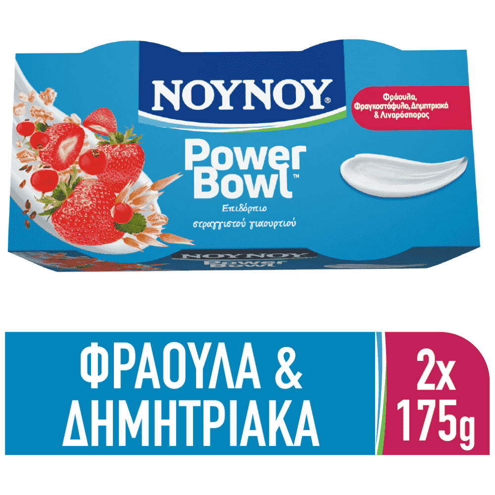 Στραγγιστό γιαούρτι 82% (Παστεριωμένο συμπυκνωμένο και φρέσκο παστεριωμένο άπαχο γάλα αγελάδος, ανθόγαλα, καλλιέργεια γιαούρτης), φράουλα 7%, φρουκτόζη, νιφάδες βρώμης 0,8%, συμπυκνωμένος χυμός (γλυκοπατάτας, μήλου, καρότου, ραπανακίου), κόκκινο φραγκοστάφυλο 0,4%, λιναρόσπορος 0,4%, ηλιόσπορος 0,4%, σιτάρι 0,4%, βρώμη 0,3%, φυσικά αρώματα, άμυλο, σταθεροποιητής: πηκτίνη, ρυθμιστές οξύτητας: κιτρικό οξύ, κιτρικό νάτριο, κιτρικό ασβέστιο. Ολικά στερεά 21,5%.Αλλεργιογόνα