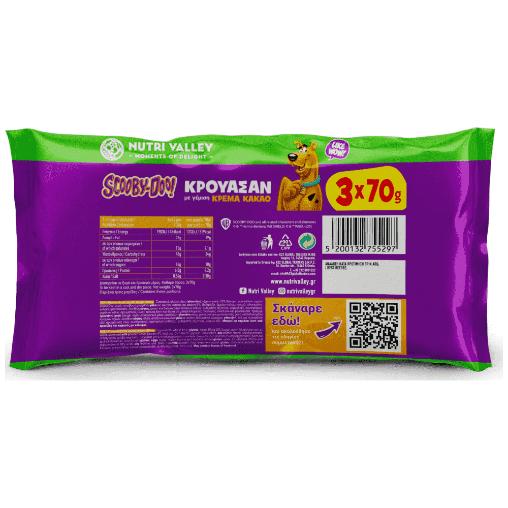 αλεύρι σίτου (γλουτένη), γέμιση κακάο 30% (ζάχαρη, φοινικέλαιο, σιρόπι γλυκόζης, νερό, αποβουτυρωμένο γάλα σε σκόνη, κακάο σε σκόνη 5%, δεξτρόζη, άμυλο καλαμποκιού, γλυκερίνη, γαλακτωματοποιητής: λεκιθίνη σόγιας, μονο- και διγλυκερίδια λιπαρών οξέων, ρυθμιστής οξύτητας: κιτρικό οξύ, συντηρητικό: σορβικό κάλιο, αρωματικές ύλες), φυτικά λίπη και έλαια σε μεταβαλλόμενες αναλογίες: ηλιέλαιο και φοινικέλαιο, προζύμι (γλουτένη), αυγά, ζάχαρη, νερό, υγροσκοπικό μέσο: σορβιτόλη, γλουτένη σίτου, μαγιά, γαλακτωματοποιητές: μονο και διγλυκερίδια λιπαρών οξέων, λεκιθίνη σόγιας, αλάτι, αποβουτυρωμένο γάλα σε σκόνη, βελτιωτικό αλεύρων: γλουτένη, ένζυμα, ασκορβικό οξύ, αρωματικές ύλες, συντηρητικό: προπιονικό ασβέστιο, ρυθμιστής οξύτητας: κιτρικό οξύ.