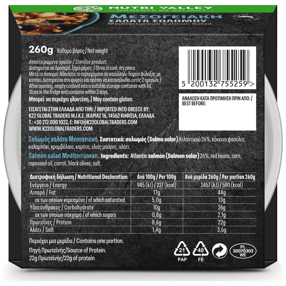 Σολωμός σαλάτα Μεσογειακή. Αποστειρωμένο προϊόν. Συστατικά: σολωμός (Salmo salar) Ατλαντικού 26%, κόκκινα φασόλια, καλαμπόκι, κραμβέλαιο, καρότο, ελιές μαύρες, αλάτι. /Salmon salad Mediterranean. Sterilized product. Ingredients: Atlantic salmon (Salmon salar) 26%, red beans, corn, rapeseed oil, carrot, black olives, msalt.