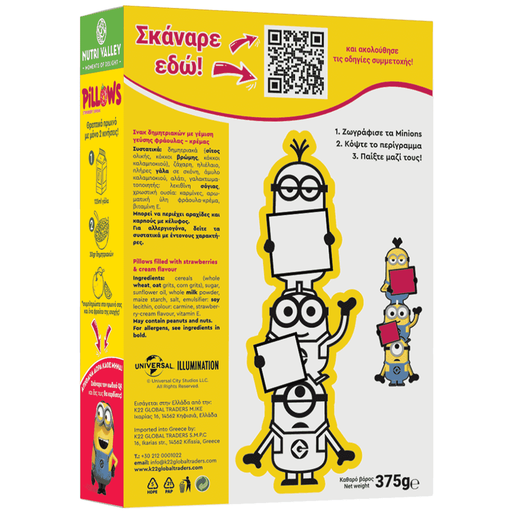 Δημητριακά {σίτος ολικής, κόκκοι βρώμης, κόκκοι καλαμποκιού}, ζάχαρη, ηλιέλαιο, πλήρες γάλα σε σκόνη, άμυλο καλαμποκιού, αλάτι, γαλακτωματοποιητής: λεκιθίνη σόγιας, χρωστική ουσία: καρμίνες, αρωματική ύλη φράουλα - κρέμα, βιταμίνη Ε. Ingredients: cereals (whole wheat, oat grits, corn grits), sugar, sunflower oil, whole milk powder, maize starch, salt, emulsifier: soy lecithin, colour: carmine, strawberry-cream flavour, vitamin E.