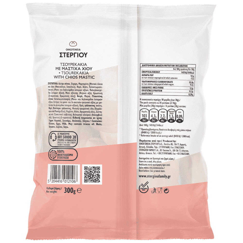 Αλεύρι σίτου, Σιρόπι γλυκόζης-φρουκτόζης, Ζάχαρη, Μαργαρίνη [Φυτικά έλαια και λίπη (Φοινικέλαιο, Σογιέλαιο), Νερό, Αλάτι, Γαλακτωματοποιητές (Μονο- και διγλυκερίδια λιπαρών οξέων, Πολυγλυκερίδια λιπαρών οξέων), Μέσο οξίνισης (Κιτρικό οξύ), Χρωστική (β-καροτένιο), Αρωματικές ύλες], Μαγιά, Αυγά, Γλουτένη σίτου, Νερό, Γαλακτωματοποιητές (Μονο- και διγλυκερίδια λιπαρών οξέων, Εστέρες του μονο- και δι-ακετυλο-τρυγικού οξέος με μονο-και δι-γλυκερίδια λιπαρών οξέων), Ορός γάλακτος σκόνη, Βούτυρο γάλακτος, Μαχλέπι, Φυσική αρωματική ύλη (Εκχύλισμα από Μαστίχα Χίου), Σταθεροποιητής (Σορβιτόλη), Αλάτι, Συντηρητικό (Προπιονικό ασβέστιο), Αντιοξειδωτικά (Ασκορβικό οξύ, Κιτρικό οξύ), Αρωματικές ύλες, Χρωστική (β-καροτένιο).Αλλεργιογόνα