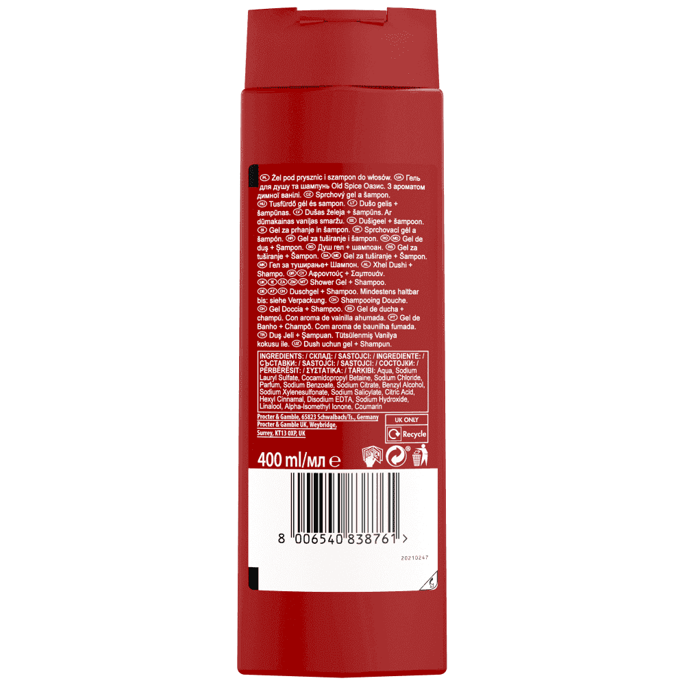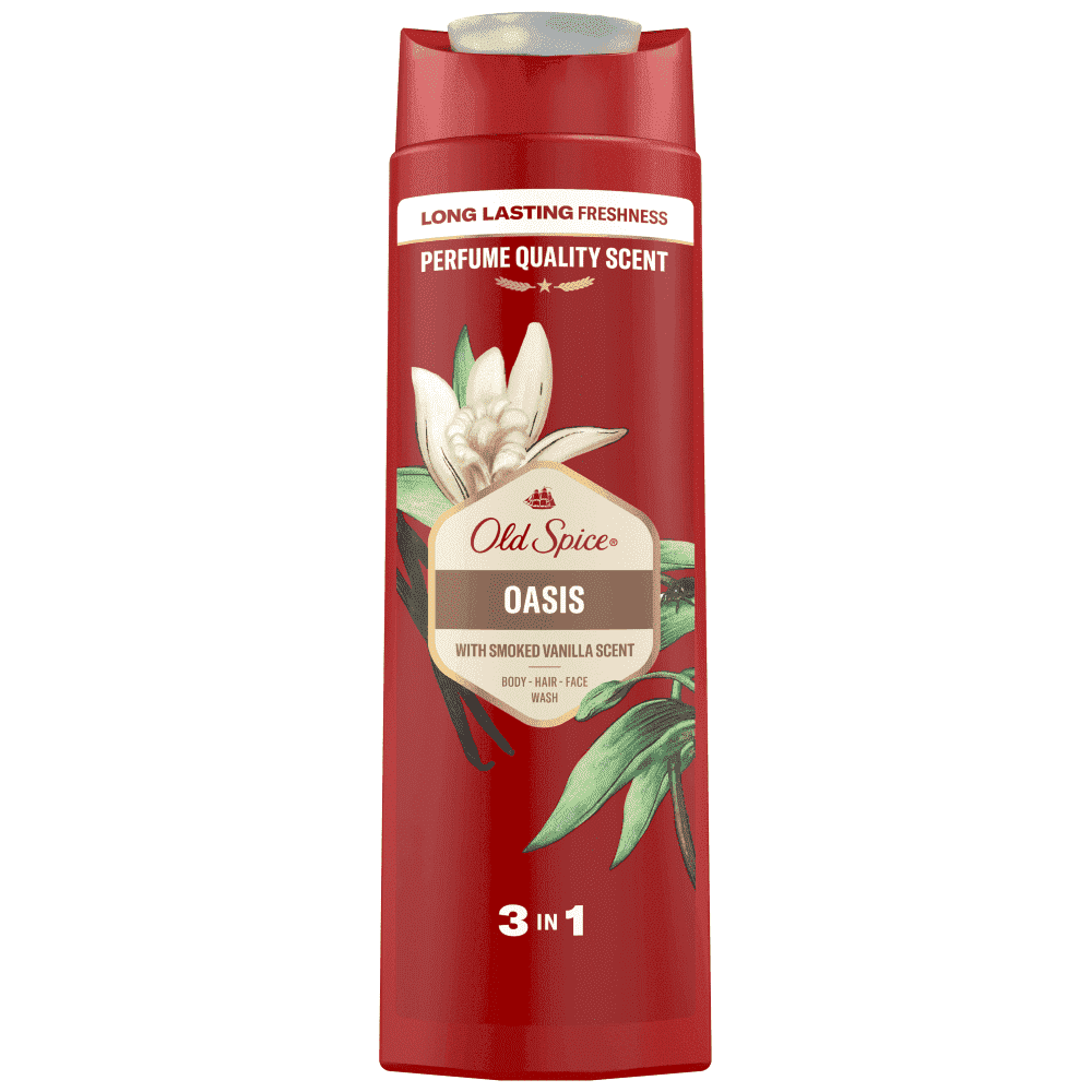 Απολαύστε αξέχαστη φρεσκάδα μεγάλης διάρκειας και τη σιγουριά της ευχάριστης μυρωδιάς με το Αφρόλουτρο και Σαμπουάν Old Spice για άντρες. Χάρη στη σύνθεση βαθύ καθαρισμού και τα αρώματα υψηλής ποιότητας, απομακρύνονται η βρομιά και οι οσμές, χαρίζοντάς σας φρεσκάδα και καθαριότητα. Αυτή η σύνθεση 3 σε 1 πολλαπλών χρήσεων επιδρά στα μαλλιά, το πρόσωπο και το σώμα, προσφέροντας στην επιδερμίδα σας μια αίσθηση ακαταμάχητης απαλότητας, ώστε να μπορείτε να επικεντρωθείτε σε πιο αξιόλογες επιδιώξεις όπως το κλείσιμο συμφωνιών ή η εκπαίδευση ομιλίας των δελφινιών. Δοκιμάστε το άρωμα υψηλής ποιότητας του Oasis και ξεκινήστε το ταξίδι για τον παράδεισο Το εκλεκτό άρωμα της καπνιστής γλυκιάς βανίλιας και του πλούσιου κεχριμπαριού αναμιγνύει φρουτώδη αρώματα με βατόμουρο για να δημιουργήσει ένα άρωμα που μοιάζει με απολαυστικές διακοπές για τη μύτη σας