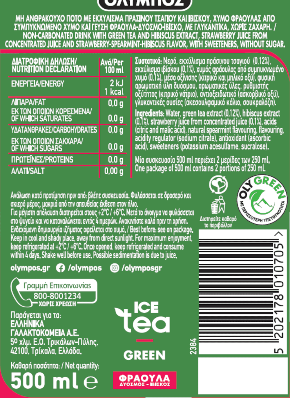 Νερό, εκχύλισμα πράσινου τσαγιού (0,12%), εκχύλισμα ιβίσκου (0,10%), χυμός φράουλας από συμπυκνωμένο χυμό (0,1%), μέσο οξίνισης (κιτρικό και μηλικό οξύ), φυσική αρωματική ύλη δυόσμου, αρωματικές ύλες, ρυθμιστής οξύτητας (κιτρικό νάτριο), αντιοξειδωτικό (ασκορβικό οξύ), γλυκαντικές ουσίες (ακεσουλφαμικό κάλιο, σουκραλόζη)Αλλεργιογόνα