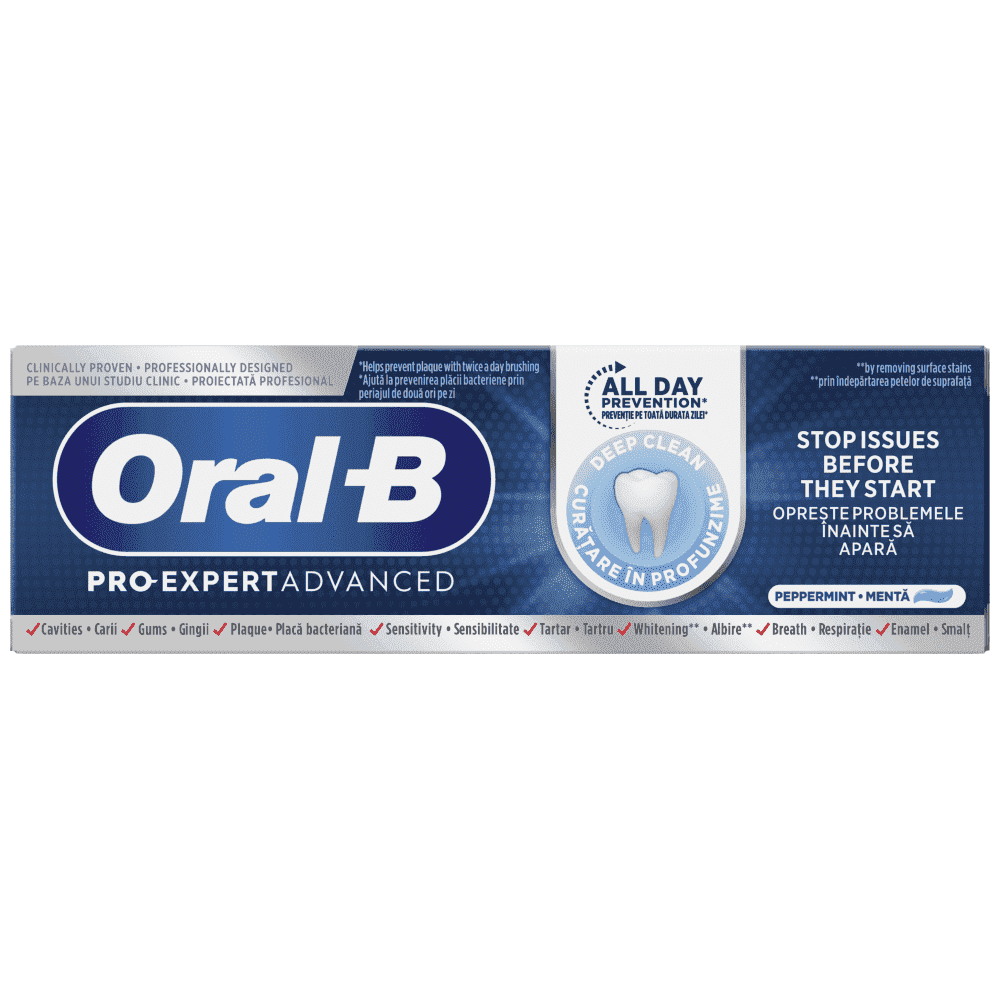 Η Oral-B Pro-Expert Advanced Science Deep Clean είναι επαγγελματικά σχεδιασμένη και κλινικά αποδεδειγμένο ότι σταματά τα προβλήματα πριν ξεκινήσουν, βοηθώντας στην πρόληψη των επιπτώσεων της βακτηριακής πλάκας για 24 ώρες καθώς και στην προσκόλληση των δοντιών και των ούλων, όταν χρησιμοποιείται δύο φορές την ημέρα.