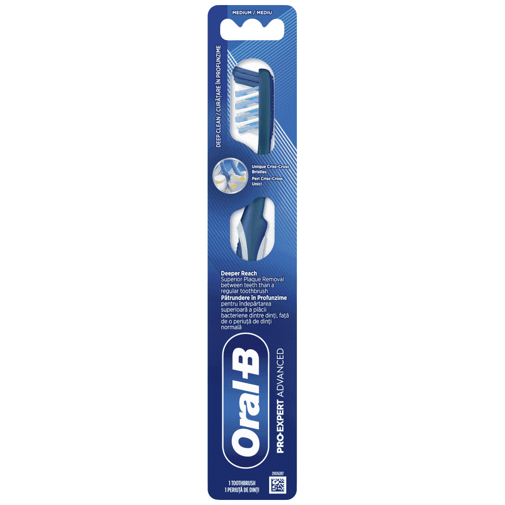 Πετύχετε βαθύ και απαλό καθαρισμό με την προηγμένη οδοντόβουρτσα ORAL-B PRO-CLEAN ADVANCED. Αυτή η χειροκίνητη βούρτσα αξιοποιεί μοναδικές σταυρωτές ίνες για να φτάνει βαθύτερα ανάμεσα στα δόντια και να αφαιρεί περισσότερη πλάκα από μια συνηθισμένη οδοντόβουρτσα. Τα νήματα πολλαπλών άκρων κρατούν καλύτερα και αφαιρούν την κολλώδη πλάκα, ενώ το ενσωματωμένο εργαλείο καθαρισμού γλώσσας αφαιρεί τα βακτήρια από τη γλώσσα και τα μάγουλα. Φροντίστε τη στοματική σας υγεία με την ORAL-B, τη νούμερο 1 μάρκα που χρησιμοποιούν οι οδοντίατροι παγκοσμίως*.