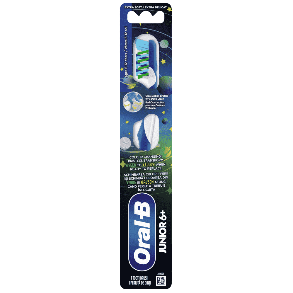 Κάντε το βούρτσισμα μια μοναδική περιπέτεια με την οδοντόβουρτσα ORAL-B JUNIOR 6+ Αυτή η χειροκίνητη βούρτσα είναι σχεδιασμένη για παιδιά ηλικίας 6-12 ετών και καθαρίζει τόσο τα πρώτα όσο και τα μόνιμα δόντια, με τη δράση της τρίχας CrissCross που αφαιρεί την πλάκα σε δυσπρόσιτα σημεία. Το ενσωματωμένο εργαλείο καθαρισμού γλώσσας αφαιρεί τα βακτήρια από τη γλώσσα και τα μάγουλα και η πρωτοποριακή τεχνολογία αλλαγής χρώματος σάς ενημερώνει πότε να αντικαταστήσετε τη βούρτσα σας.