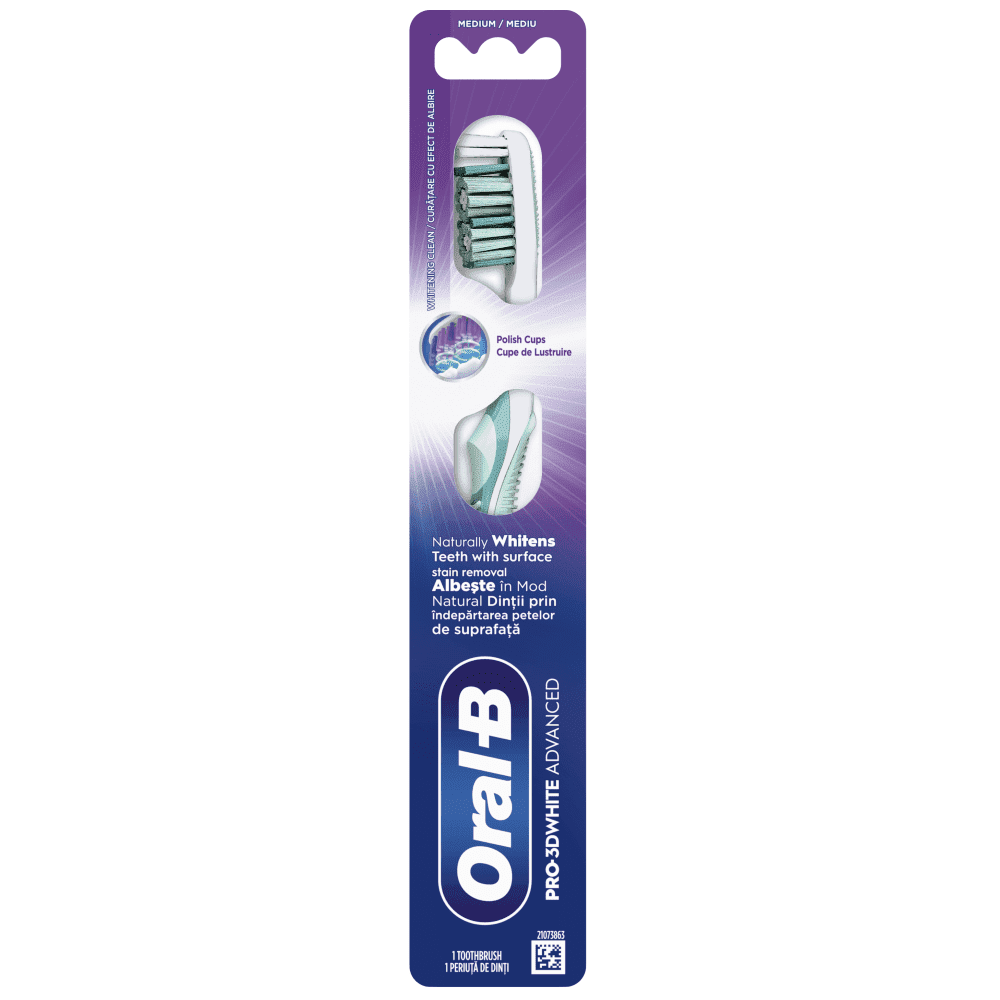 Αφαιρέστε την πλάκα και τους λεκέδες με ευκολία με την οδοντόβουρτσα ORAL-B PRO-3DWHITE ADVANCED. Αυτή η χειροκίνητη βούρτσα αφαιρεί την πλάκα και έως και το 80% των επιφανειακών λεκέδων με βαθύ καθαρισμό από όλες τις γωνίες. Τα χαρακτηριστικά ακριβείας περιλαμβάνουν ίνες με πολύ χαμηλό ύψος που εισχωρούν ανάμεσα στα δόντια, δυναμικές άκρες που φτάνουν πίσω από τους γομφίους και κύπελλα πολλαπλής στίλβωσης που περιβάλλουν κάθε δόντι και απομακρύνουν τους επιφανειακούς λεκέδες. Πετύχετε ένα πιο φωτεινό, λευκό χαμόγελο και φροντίζετε τη στοματική σας υγεία με την ORAL-B, τη νούμερο 1 μάρκα που χρησιμοποιούν οι οδοντίατροι παγκοσμίως*.