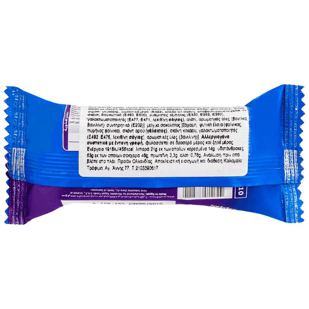 Κέικ κακάο με γέμιση με γεύση βανίλιας ζάχαρη, αλεύρι σίτου, φοινικέλαιο, αυγό, σιρόπι γλυκόζης, υγραντικό μέσο (E422), σκόνη κακάο, αποβουτυρωμένο γάλα σε σκόνη, διογκωτικά μέσα (E450, E500), ρυθμιστές οξύτητας (E330, E262, E260), γαλακτωματοποιητές (E477, E471, λεκιθίνη σόγιας), αλάτι, αρωματικές ύλες (βανίλια, βανιλίνη), συντηρητικό (E202)], μείγμα σοκολάτας [ζάχαρη, φυτικά έλαια (φοινικέλαιο, πυρηνέλαιο φοινικοπυρήνων), σκόνη ορού γάλακτος (γάλα), σκόνη κακάο, γαλακτωματοποιητές (E492, E476, λεκιθίνη σόγιας), αρωματική ύλη (βανιλίνη)].Αλλεργιογόνα