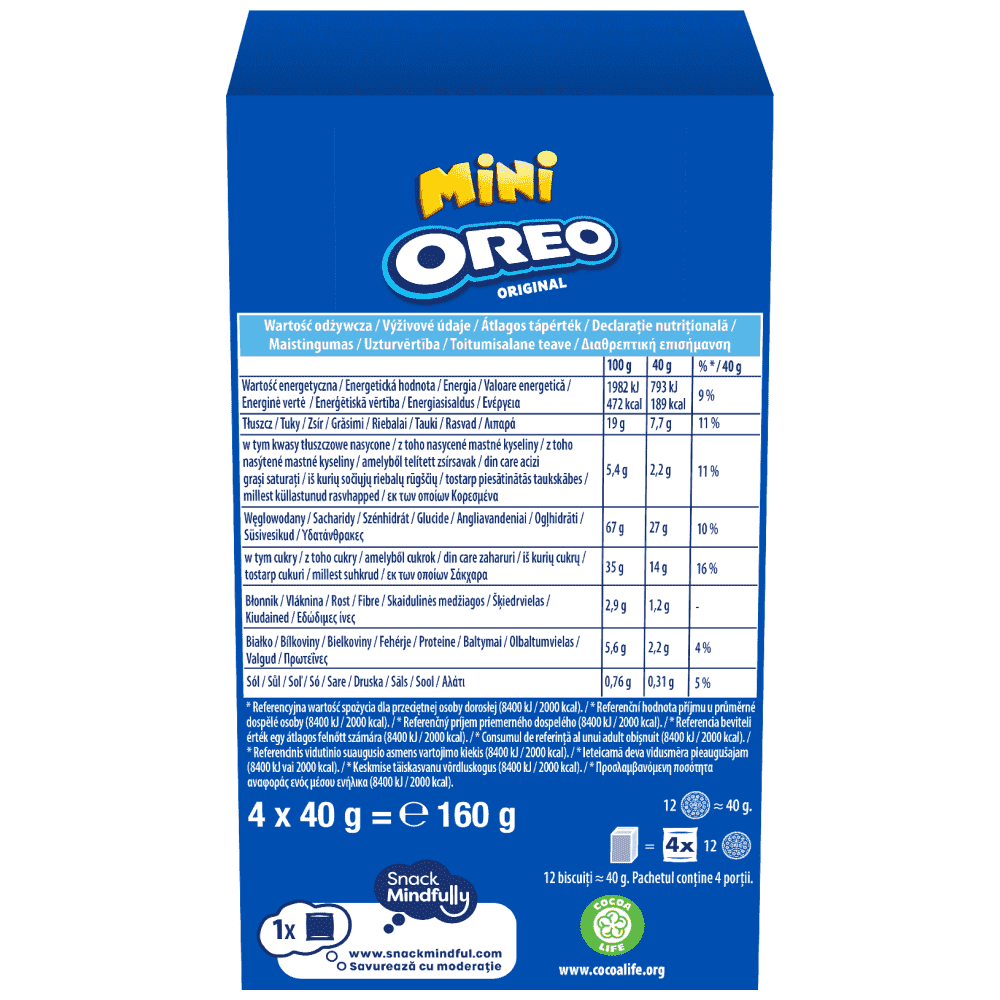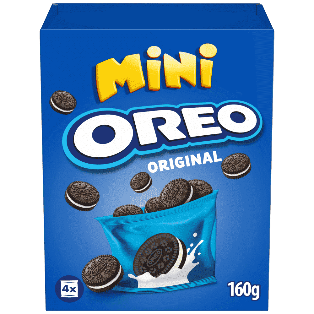Το OREO Mini αποτελείται από δύο τραγανά μπισκότα με πλούσια γεύση κακάο και μία στρώση απολαυστικής κρέμας με άρωμα βανίλια, δημιουργώντας τον πιο ξεχωριστό συνδυασμό, σε mini μέγεθος. Παρασκευάζεται με αυθεντικό κακάο, προσφέροντας μία γευστική εμπειρία που ξυπνάει την παιχνιδιάρικη διάθεση μέσα μας! Οι μικρές παιχνιδιάρικες μπουκιές OREO Mini είναι ιδανικές για να σε συντροφεύουν σε οποιαδήποτε στιγμή της ημέρας. Τώρα σε νέα συσκευασία, που περιέχει 4 σακουλάκια με OREO Mini για να τα έχεις πάντα και παντού μαζί σου!