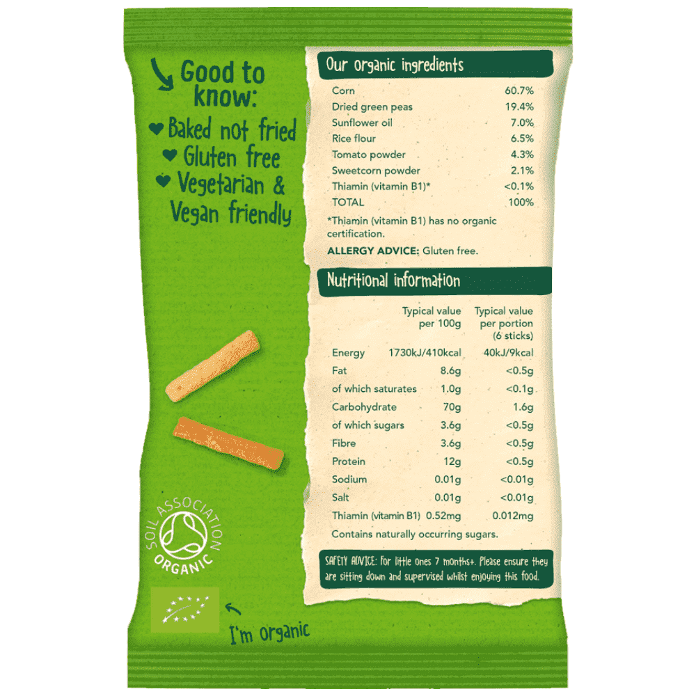 Βιολογικό ψημένο σνακ καλαμποκιού με λαχανικά, κατάλληλο για μωρά άνω των 7 μηνών. Ενθουσιάστε τα μικρά σας ζουζούνια με τα Melty Veggie Sticks! Τα βιολογικά μπαστουνάκια λαχανικών της Organix είναι ένα εξαιρετικό ψημένο σνακ, που δεν τηγανίζεται, κατάλληλο για μωρά άνω των 7 μηνών, Λαχταριστά, αρωματισμένα με πράσινο αρακά, γλυκό καλαμπόκι και τομάτες, είναι απαλά ψημένα, ώστε ενώ είναι τραγανά, να λιώνουν στο στόμα, για ένα ασφαλές σνακ. Είναι σε σχήμα 'στικ' για να τα κρατούν εύκολα τα μικρά δαχτυλάκια, καθιστώντας τα ιδανικά για μωρά που μαθαίνουν να τρέφονται μόνα τους. Ψημένο, όχι τηγανητό/ Χωρίς γλουτένη /Χωρίς προοσθήκη ζάχαρης ή αλατιού /Χωρίς τεχνητά πρόσθετα, χρώματα ή γεύσεις/ Vegan Η Organix εγγυάται πως τα τρόφιμα της προέρχονται από την καλύτερη ποιότητα βιολογικών και φυσικών συστατικών, χωρίς περιττά πρόσθετα, τεχνητές ή χρωστικές ουσίες, ώστε να ταιριάζουν με τις διατροφικές ανάγκες των παιδιών. "That’s the No Junk promise!"