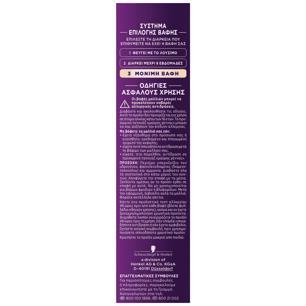 Πριν τη εφαρμογή, παρακαλούμε διαβάστε προσεκτικά τις ΟΔΗΓΙΕΣ ΑΣΦΑΛΟΥΣ ΧΡΗΣΗΣ. Μη λούζετε τα μαλλιά σας 24 - 48 ώρες πριν τη βαφή. Μην αφήνετε το προϊόν να έρθει σε επαφή με τα ρούχα ή συνθετικά υλικά γιατί οι λεκέδες είναι δύσκολο να καθαριστούν.