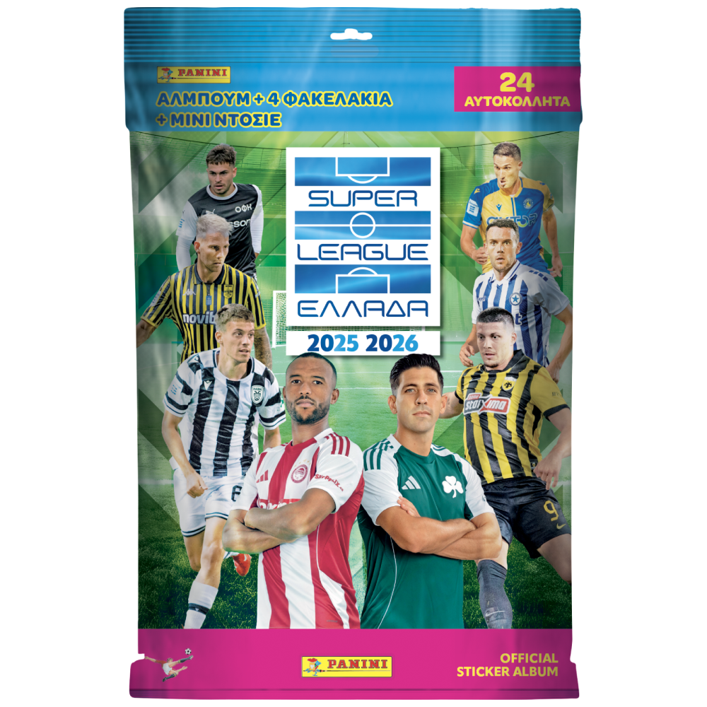 Το starter pack της συλλογής Super League αυτοκόλλητα 2025-2026 περιέχει 1 album 56 σελίδων, 4 φακελάκια με αυτοκόλλητα και 1 mini ντοσιέ . Συνολικά περιέχει 24 αυτοκόλλητα.