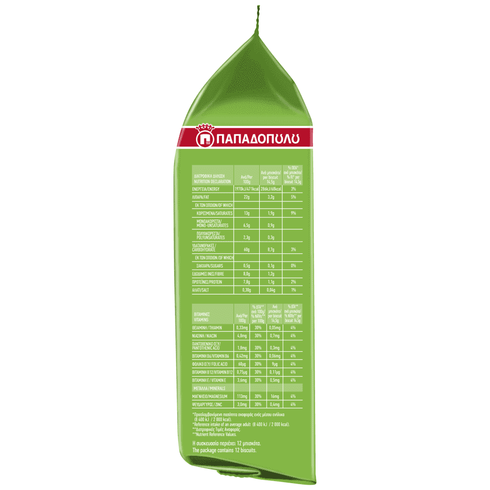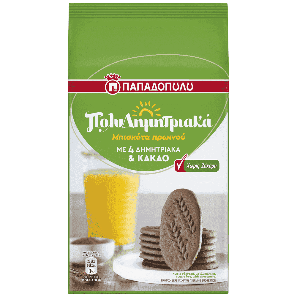 Mπισκότα με 4 δημητριακά και κακάο χωρίς σάκχαρα, με γλυκαντικά - Συστατικά: Δημητριακά 60% (αλεύρι σίτου 53%, αλεύρι σίτου ολικής άλεσης 4%, νιφάδες βρώμης 1%, αλεύρι σίκαλης ολικής άλεσης 1%, αλεύρι κριθαριού ολικής άλεσης 1%), φυτικά έλαια (φοινικέλαιο, φοινικοπυρηνέλαιο, κραμβέλαιο), γλυκαντικά (μαλτιτόλη, σιρόπι σορβιτόλης), δεξτρίνη σίτου, αποβουτυρωμένο κακάο σε σκόνη 2,5%, διογκωτικά αρτοποιίας (όξινο ανθρακικό νάτριο, όξινο ανθρακικό αμμώνιο, όξινο τρυγικό κάλιο), χρωστική (εναμμώνιο καραμελόχρωμα), αλεύρι βύνης κριθαριού, γλουτένη σίτου, άμυλο, γαλακτωματοποιητές (μόνο- και διγλυκερίδια λιπαρών οξέων, λεκιθίνη σόγιας), αλάτι, αντιοξειδωτικά (παλμιτικό ασκορβύλιο, εκχύλισμα πλούσιο σε τοκοφερόλες), αρωματικές ύλες, βιταμίνες & μέταλλα (βιταμίνη Ε, νιασίνη, παντοθενικό οξύ, βιταμίνη Β12, φολικό οξύ, θειαμίνη, βιταμίνη Β6, μαγνήσιο, ψευδάργυρος).