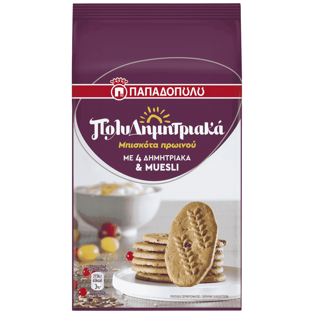 Mπισκότα με 4 δημητριακά και μούσλι - Συστατικά: Δημητριακά 52% (αλεύρι σίτου 43%, αλεύρι σίτου ολικής άλεσης 4,5%, νιφάδες βρώμης 2%, αλεύρι σίκαλης ολικής άλεσης 1,5%, αλεύρι κριθαριού ολικής άλεσης 1%) ζάχαρη, φυτικό έλαιο (φοινικέλαιο), κορινθιακή σταφίδα 3%, κομμάτια κράνμπερι 3% (κράνμπερι 50%, ζάχαρη, δεξτρόζη, ρυθμιστής οξύτητας: κιτρικό οξύ), φυτικές ίνες, άμυλο, υγροσκοπικό μέσο (σιρόπι σορβιτόλης), λακτόζη, πρωτεΐνες γάλακτος, αποβουτυρωμένο γάλα σε σκόνη, κομμάτια σουλτανίνας 1% (σουλτανίνα 62%, ζάχαρη, δεξτρόζη, φυτικό έλαιο: βαμβακέλαιο), αλεύρι βύνης κριθαριού, διογκωτικά αρτοποιίας (όξινο ανθρακικό νάτριο, όξινο ανθρακικό αμμώνιο, όξινο τρυγικό κάλιο), γλουτένη σίτου, γαλακτωματοποιητές (εστέρες του μονο- και διακετυλοτρυγικού οξέος με μονο- και διγλυκερίδια λιπαρών οξέων, λεκιθίνη σόγιας), αλάτι, αντιοξειδωτικά (παλμιτικό ασκορβύλιο, εκχύλισμα πλούσιο σε τοκοφερόλες), αρωματικές ύλες, βιταμίνες & μέταλλα (βιταμίνη Ε, νιασίνη, παντοθενικό οξύ, βιταμίνη Β12, φολικό οξύ, θειαμίνη, βιταμίνη Β6, μαγνήσιο, ψευδάργυρος).