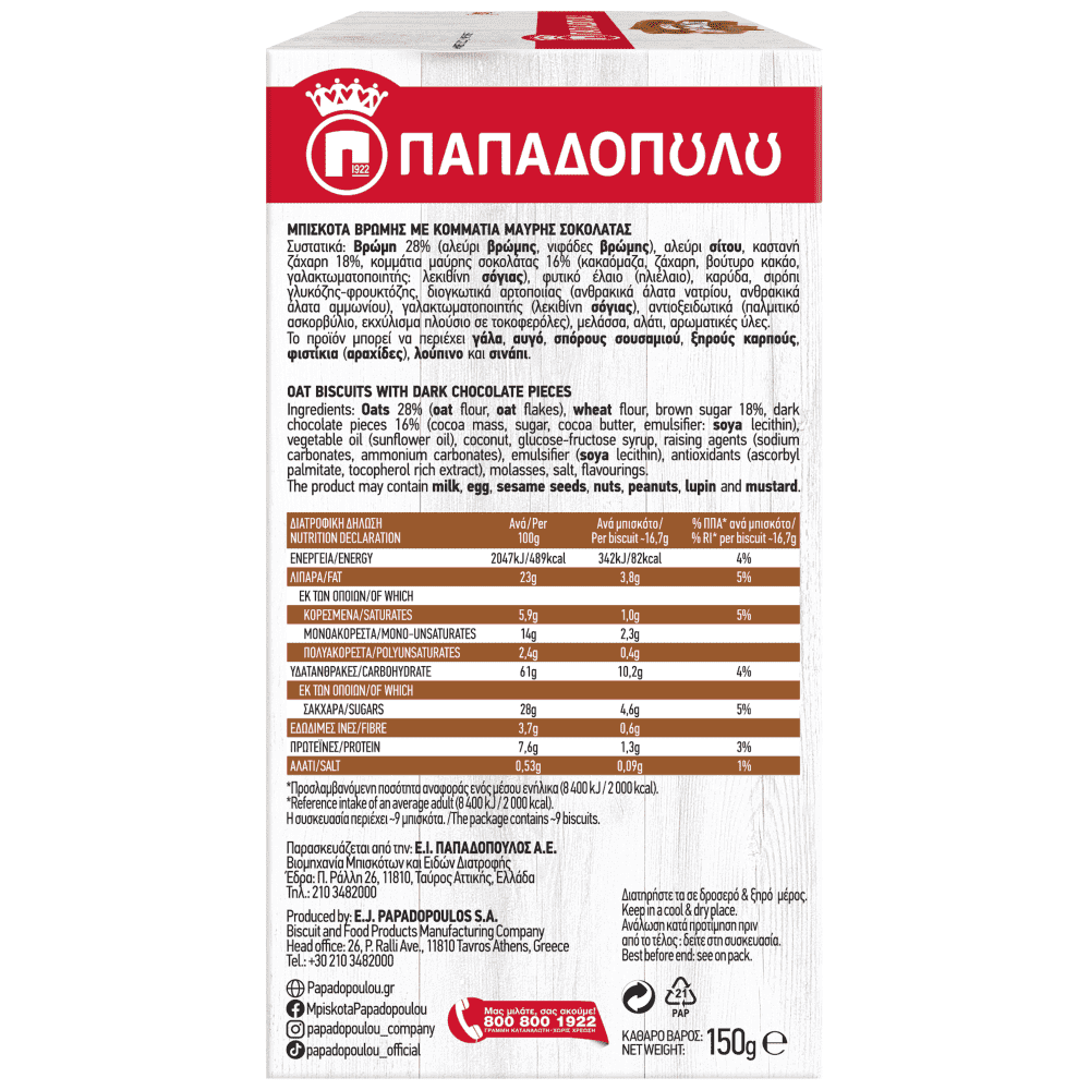 <p><strong>Βρώμη</strong> 28% (αλεύρι <strong>βρώμης,</strong> νιφάδες <strong>βρώμης</strong>), αλεύρι σίτου, καστανή ζάχαρη 18%, κομμάτια μαύρης σοκολάτας 16% (κακαόμαζα, ζάχαρη, βούτυρο κακάο, γαλακτωματοποιητής: λεκιθίνη <strong>σόγιας</strong>), φυτικό έλαιο (ηλιέλαιο), καρύδα, σιρόπι γλυκόζης-φρουκτόζης, διογκωτικά αρτοποιίας (όξινο ανθρακικό νάτριο, όξινο ανθρακικό αμμώνιο), γαλακτωματοποιητής (λεκιθίνη <strong>σόγιας</strong>), αντιοξειδωτικά (παλμιτικό ασκορβύλιο, εκχύλισμα πλούσιο σε τοκοφερόλες), μελάσσα, αλάτι, αρωματικές ύλες.</p>nnΑλλεργιογόνα