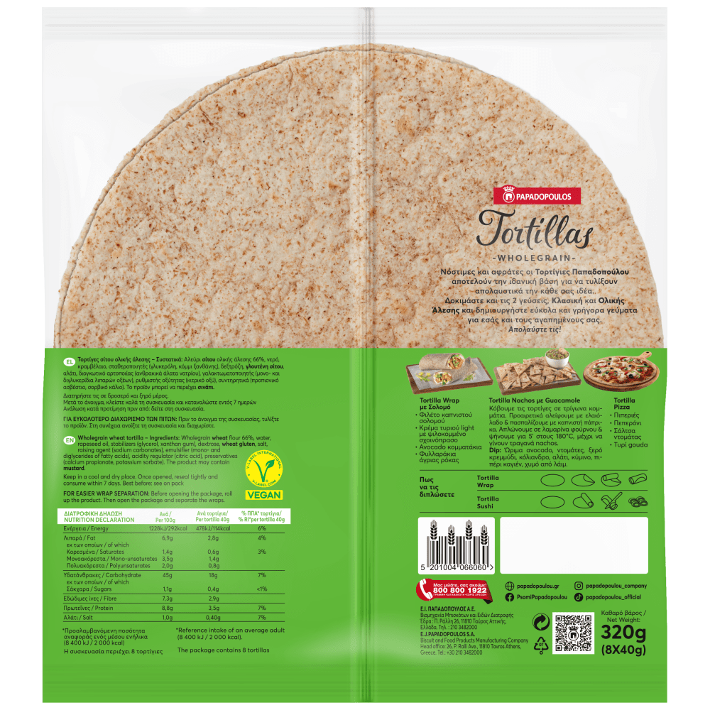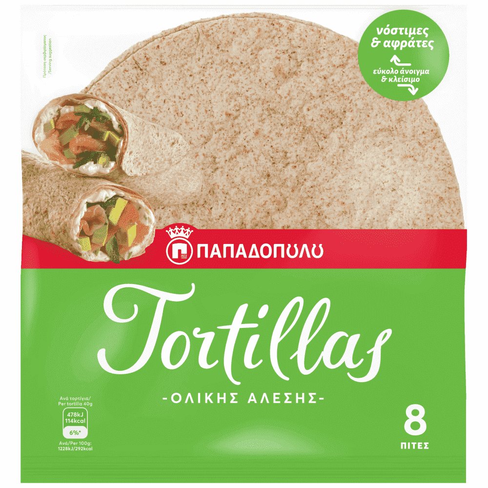 Με τις Tortillas Παπαδοπούλου Ολικής Άλεσης, δημιουργήστε απεριόριστους γευστικούς συνδυασμούς σε αλμυρή ή γλυκιά εκδοχή για εσάς και τους φίλους σας, για ένα γρήγορο snack στο γραφείο ή και ένα ελαφρύ βραδινό γεύμα στο σπίτι. Είναι νόστιμες και μαλακές για να τυλίξουν εύκολα και γρήγορα την κάθε σας ιδέα.
