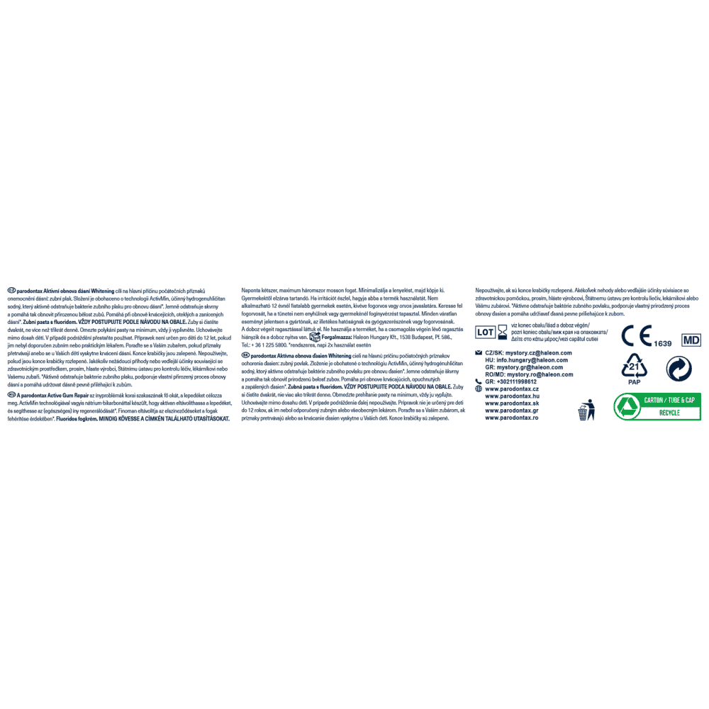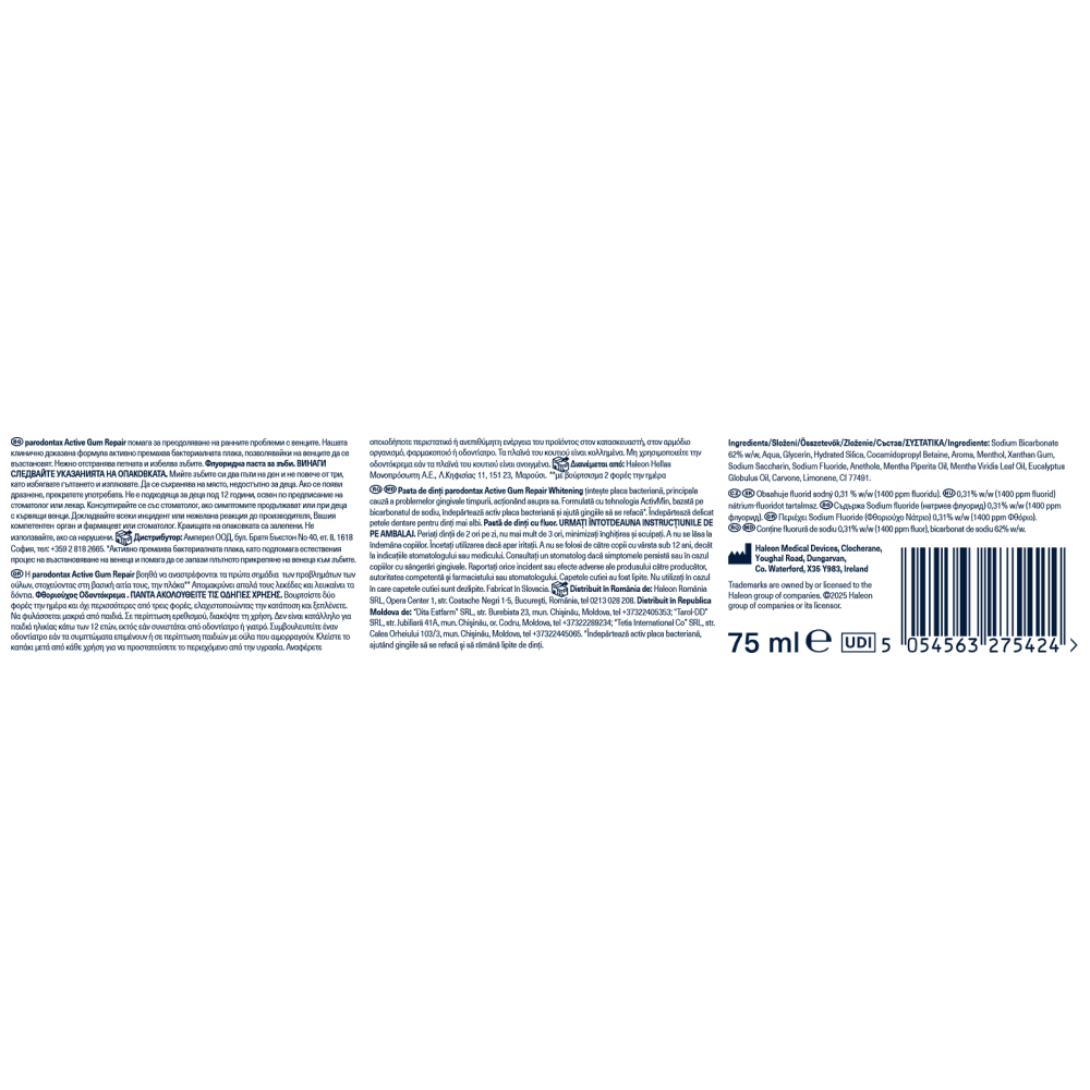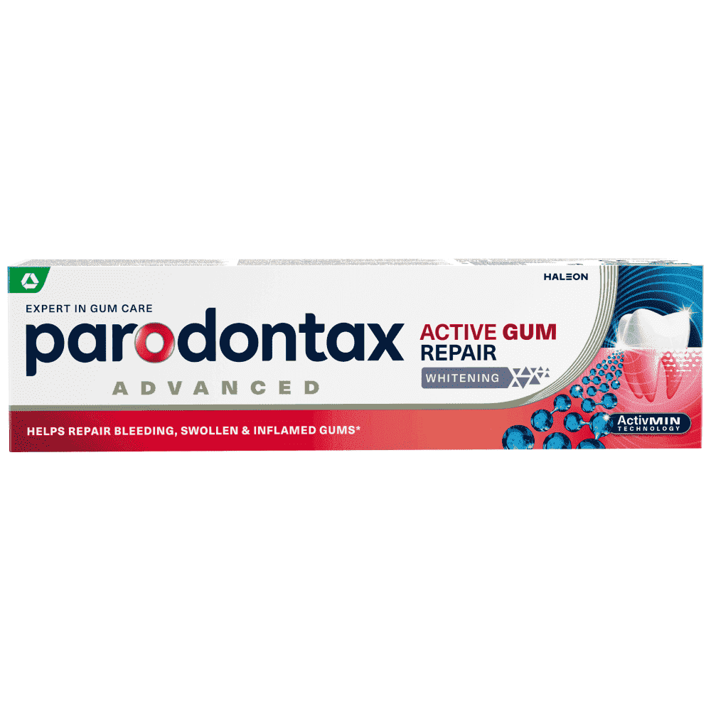 Φθοριούχος οδοντόκρεμα καθημερινής χρήσης για τα προβλήματα των ούλων. H PARODONTAX ACT.GUM REPAIR WHITE 75ML βοηθά στην αποκατάσταση των πρησμένων και κόκκινων ούλων που αιμορραγούν ΜΕΣΑ ΣΕ ΜΙΑ ΕΒΔΟΜΑΔΑ. Τα υγιή ούλα σχηματίζουν μια σφιχτή σφράγιση γύρω από τα δόντια. Όταν η βακτηριακή πλάκα συσσωρεύεται κατά μήκος της γραμμής των ούλων, η σύνδεση ανάμεσα στα ούλα και τα δόντια μπορεί να εξασθενήσει προκαλώντας αιμορραγία, πρήξιμο και φλεγμονή στα ούλα. Η νέα parodontax Active Gum Repair βοηθά να αναστρέφονται τα πρώτα σημάδια των προβλημάτων των ούλων, στοχεύοντας στη βασική αιτία τους, την πλάκα. Επιπλέον, απομακρύνει απαλά τους λεκέδες και λευκάινει τα δόντια.