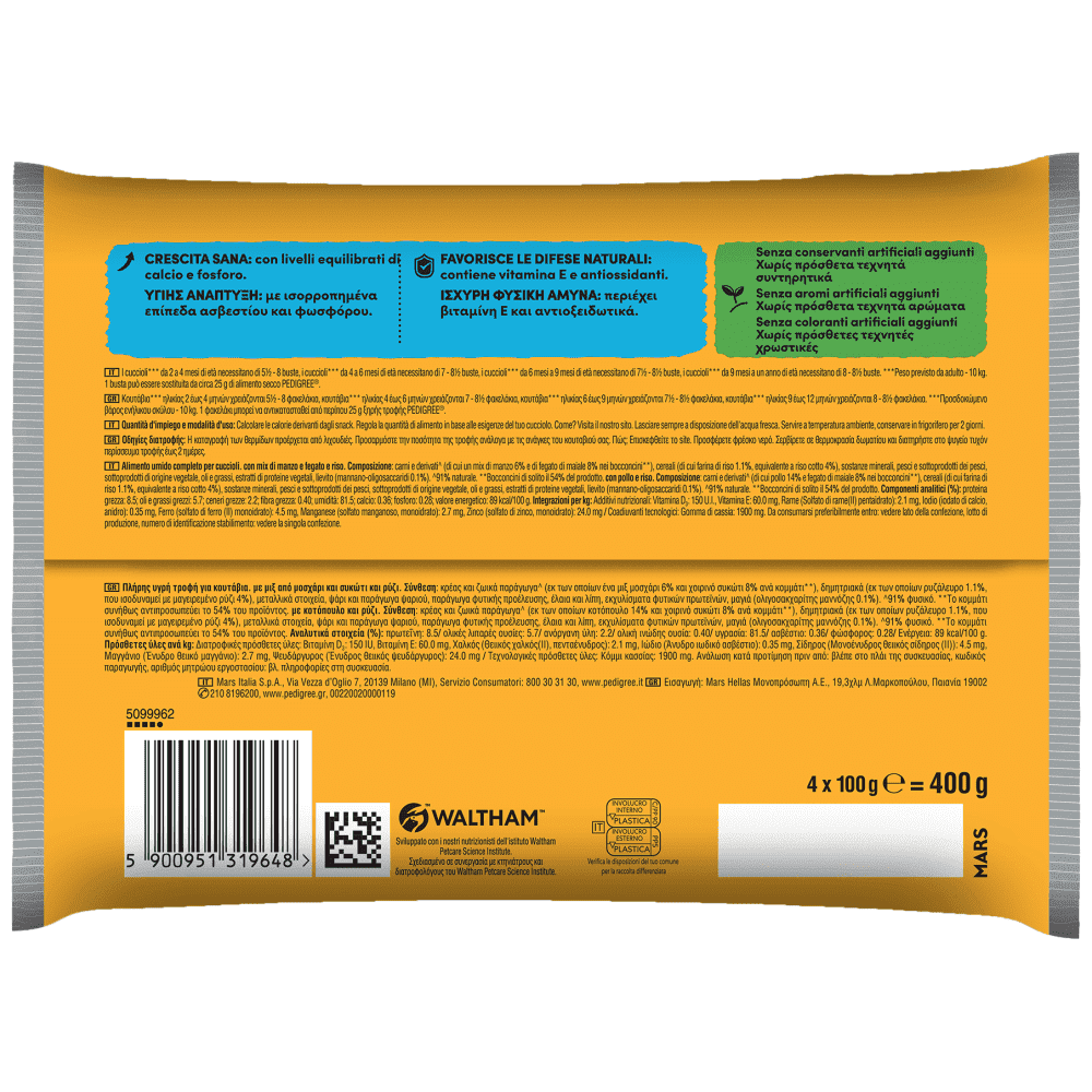 "Πλήρης υγρή τροφή για κουτάβια. Κουτάβια*** ηλικίας 2 έως 4 μηνών χρειάζονται 5½ - 8 φακελάκια, κουτάβια*** ηλικίας 4 έως 6 μηνών χρειάζονται 7 -