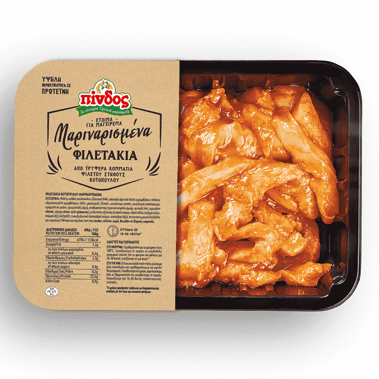 «ΦΙΛΕΤΑΚΙΑ ΜΑΡΙΝΑΡΙΣΜΕΝΑ»: Φιλέτο στήθος σε αυτούσια μορφή κομμένο σε λωρίδες, αναμιγνύεται με φυσική μαρινάδα, συσκευάζεται και αποθηκεύετε υπό ψύξη.