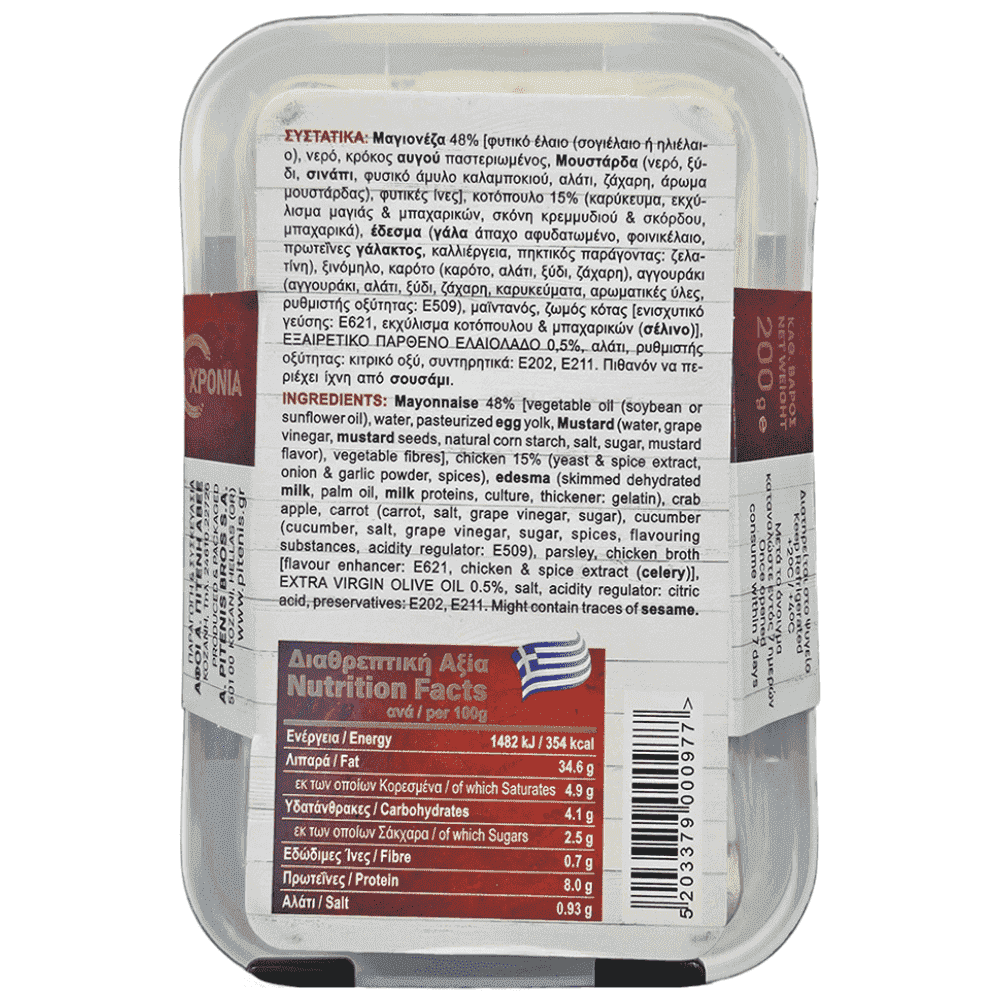 Μαγιονέζα 48%: [φυτικό έλαιο (σογιέλαιο ή/και ηλιέλαιο), νερό, μουστάρδα (νερό, ξύδι, σινάπι, φυσικό άμυλο αραβοσίτου, ζάχαρη, άρωμα μουστάρδας), παστεριωμένος κρόκος αυγού, πηκτικοί παράγοντες: (τροποποιημένα άμυλα Ε1442 και Ε1422, φυσικό άμυλο πατάτας , κόμμι ξανθάνης, φυτικές ίνες, φύκη )], κοτόπουλο βρασμένο 15% (προέλευση ΕΕ), έδεσμα με φυτικά λιπαρά : (αφυδατωμένο αγελαδινό γάλα, πρωτεΐνες γάλακτος, φοινικέλαιο, τροποποιημένο άμυλο αραβοσίτου, πηκτικός παράγοντας: βόεια ζελατίνη, γαλακτωματοποιητής: Ε471, καλλιέργεια γιαούρτης),  ξινόμηλο 11%, καρότο 5% και αγγουράκι: (περιέχουν αλάτι, ξύδι, ζάχαρη, αρωματικές ύλες, ρυθμιστή οξύτητας: κιτρικό οξύ, χλωριούχο ασβέστιο), μαϊδανός, ζωμός κότας σκόνη:  (περιέχει χρωστική: Ε150a, ενισχυτικό γεύσης: Ε621), καρυκεύματα, εξαιρετικά παρθένο ελαιόλαδο 0,5%, αλάτι, συντηρητικά: (Ε211, Ε202), φυσική χρωστική: κουρκουμίνη.Αλλεργιογόνα