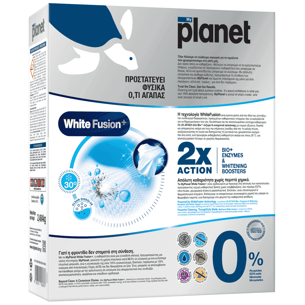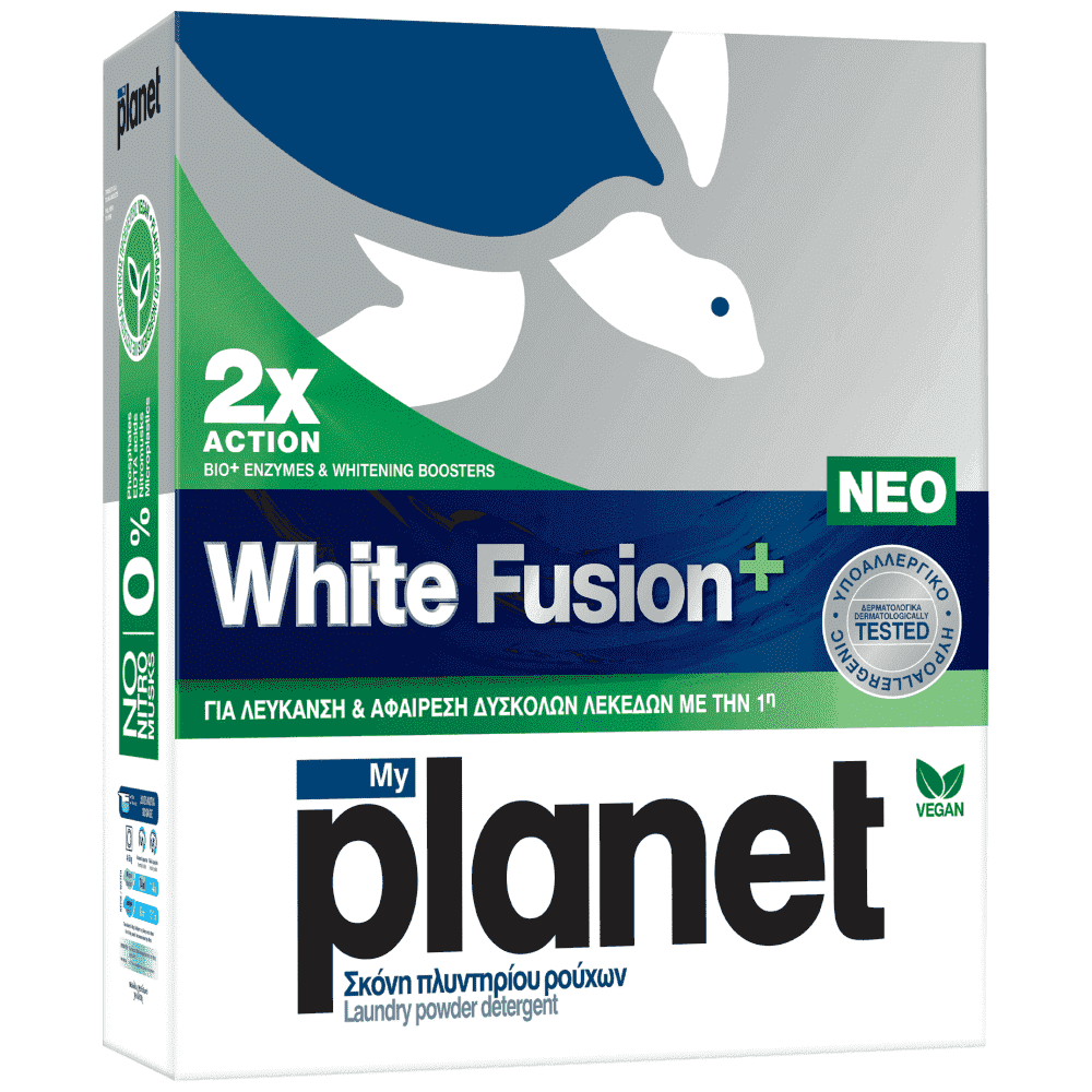 Νέο MyPlanet White Fusion +. Η πανίσχυρη τεχνολογία White Fusion + με 2Χ ΔΡΑΣΗ από ΒΙΟ+ ένζυμα & ενισχυτικά λεύκανσης με ενεργό οξυγόνο, λευκαίνει τα ρούχα και αφαιρεί δύσκολους λεκέδες από την 1η πλύση, ακόμα και στους 30°C. Όλοι θέλουμε να νιώθουμε σιγουριά για τα προϊόντα που χρησιμοποιούμε στο σπίτι μας και το νέο MyPlanet είναι εδώ, καλύτερο από ποτέ!
