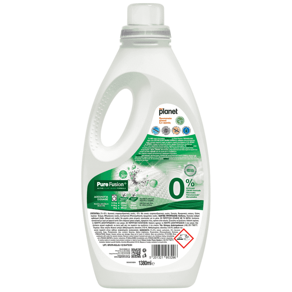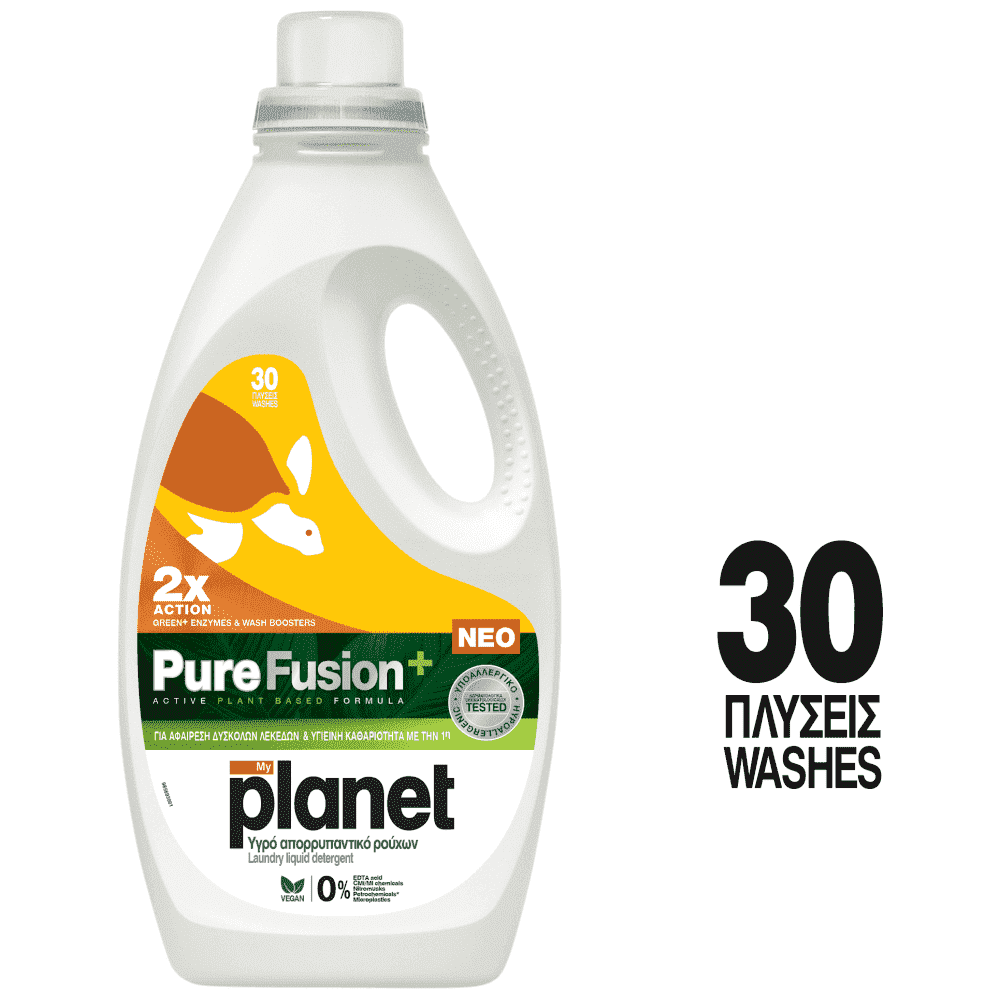 Νέο MyPlanet Pure Fusion +. Η τεχνολογία Pure Fusion + με 2X ΔΡΑΣΗ από GREEN+ ένζυμα & ενισχυτικά πλύσης αφαιρεί ακόμα και τους πιο δύσκολους λεκέδες από την 1η πλύση, ακόμα και στους 30°C, ενώ καταστέλλει την ανάπτυξη βακτηριδίων & εξουδετερώνει τις κακοσμίες. Όλοι θέλουμε να νιώθουμε σιγουριά για τα προϊόντα που χρησιμοποιούμε στο σπίτι μας και το νέο MyPlanet είναι εδώ, καλύτερο από ποτέ!