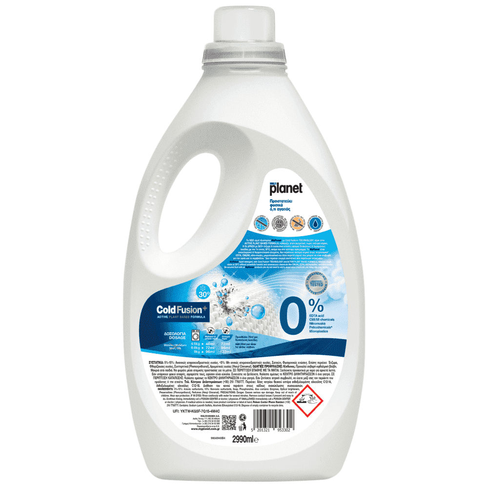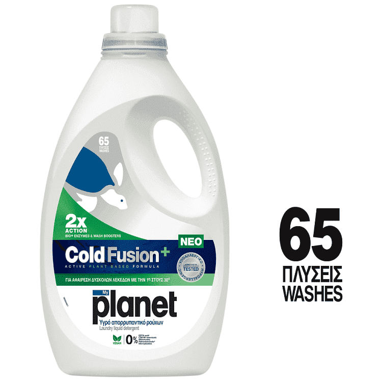 Νέο MyPlanet Cold Fusion +. H προηγμένη τεχνολογία Cold Fusion + με 2X ΔΡΑΣΗ από ΒΙΟ+ ένζυμα & ενισχυτικά πλύσης αφαιρεί ακόμα και τους πιο δύσκολους λεκέδες από την 1η πλύση, ακόμα και στους 30°C και στο σύντομο πρόγραμμα. Όλοι θέλουμε να νιώθουμε σιγουριά για τα προϊόντα που χρησιμοποιούμε στο σπίτι μας και το νέο MyPlanet είναι εδώ, καλύτερο από ποτέ!
