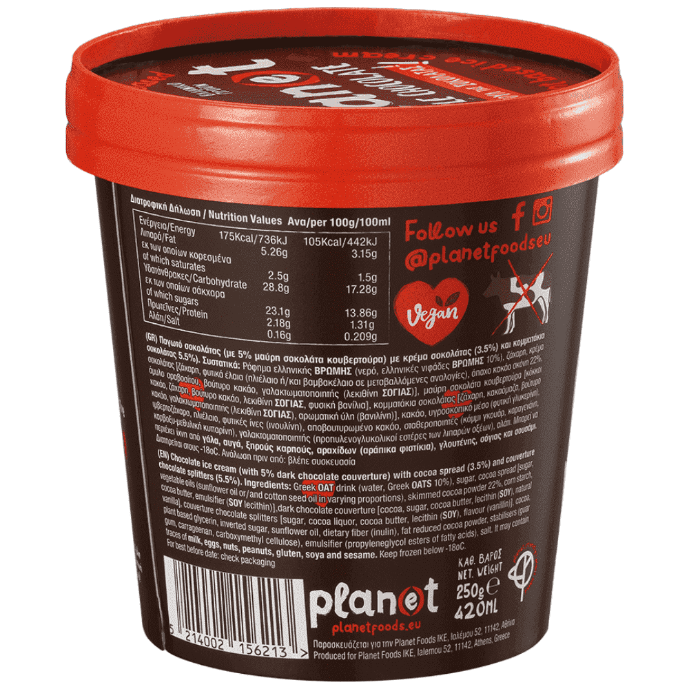 Ρόφημα ελληνικής ΒΡΩΜΗΣ (νερό, ελληνικές νιφάδες ΒΡΩΜΗΣ 10%), ζάχαρη, κρέμα σοκολάτας [ζάχαρη, φυτικά έλαια (ηλιέλαιο ή/και βαμβακέλαιο σε μεταβαλλόμενες αναλογίες), άπαχο κακάο σκόνη 22%, άμυλο αραβοσίτου, βούτυρο κακάο, γαλακτωματοποιητής (λεκιθίνη ΣΟΓΙΑΣ)], μαύρη σοκολάτα κουβερτούρα [κόκκοι κακάο, ζάχαρη, βούτυρο κακάο, λεκιθίνη ΣΟΓΙΑΣ, φυσική βανίλια], κομματάκια σοκολάτας [ζάχαρη, κακαόμαζα, βούτυρο κακάο, γαλακτωματοποιητής (λεκιθίνη ΣΟΓΙΑΣ), αρωματική ύλη (βανιλίνη)], κακάο, υγροσκοπικό μέσο (φυτική γλυκερίνη), ιμβερτοζάχαρο, ηλιέλαιο, φυτικές ίνες (ινουλίνη), αποβουτυρωμένο κακάο, σταθεροποιητές (κόμμι γκουάρ, καραγενάνη, καρβοξυ-μεθυλική κυτταρίνη), γαλακτοματοποιητής (προπυλενογλυκολικοί εστέρες των λιπαρών οξέων), αλάτι Αλλεργιογόνα