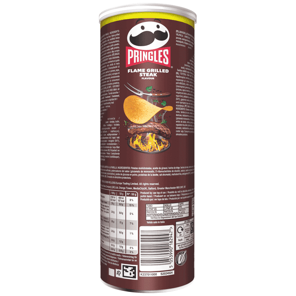 Αφυδατωμένες πατάτες, ηλιέλαιο, αλεύρι σίτου, καλαμποκάλευρο, ρυζάλευρο, καρύκευμα με γεύση μπριζόλας στη σχάρα (αρωματικές ύλες, δεξτρόζη, μαλτοδεξτρίνη, αλάτι, τροποποιημένο άμυλο αραβοσίτου, ενισχυτικά γεύσης {γλουταμινικό μονονάτριο, άλας των 5-ριβοζονουκλεοτιδίων}, ζάχαρη, ηλιέλαιο, άμυλο πατάτας, ινουλίνη, πάπρικα σε σκόνη, πιπέρι, σκόρδο σε σκόνη, ντομάτα σε σκόνη, ρυθμιστής οξύτητας {γαλακτικό οξύ}, σιρόπι γλυκόζης σε σκόνη, πρωτεΐνες γάλακτος, καπνιστό αλάτι), μαλτοδεξτρίνη, γαλακτωματοποιητής (Ε471), χρωστική ουσία (αννάτο νορμπιξίνη).