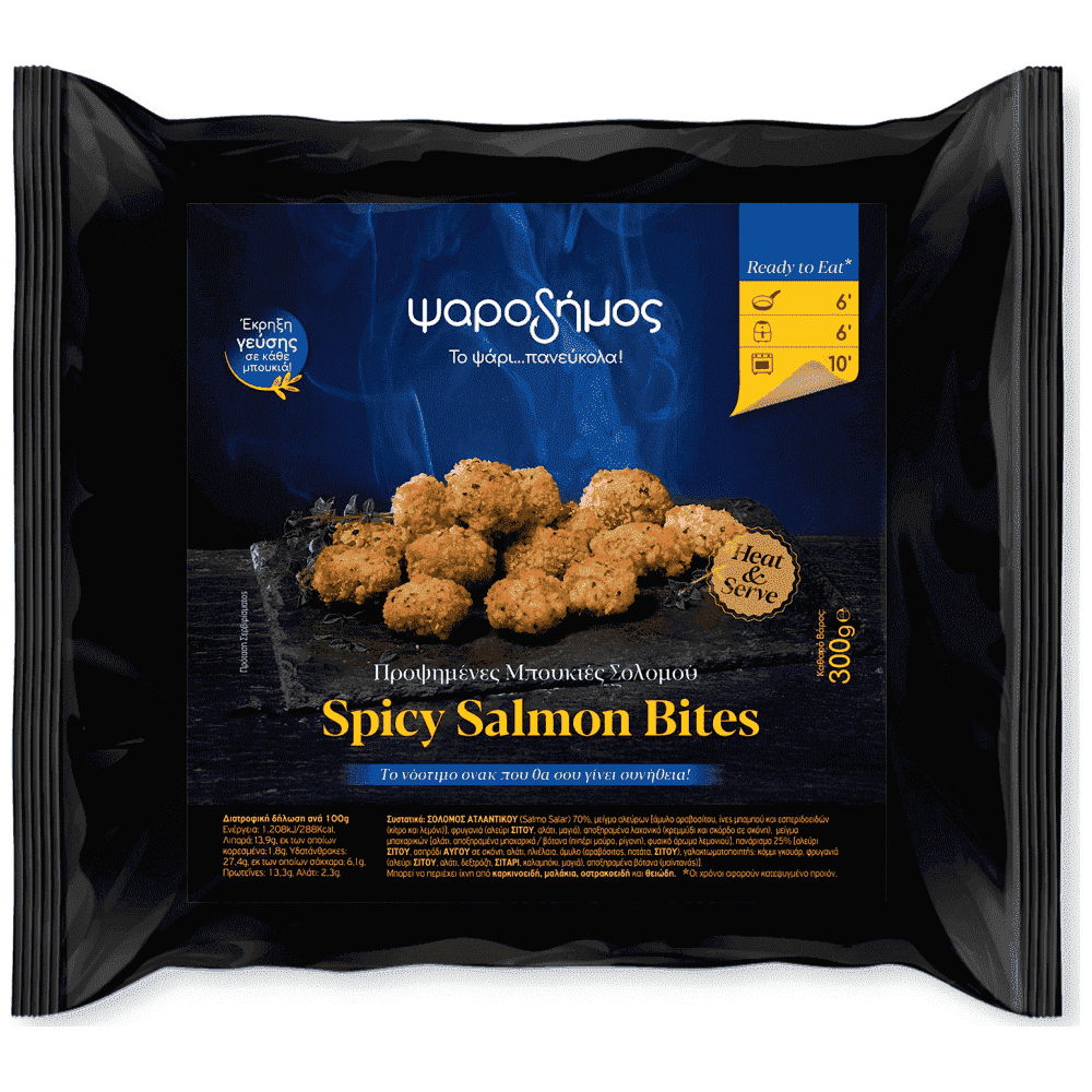 Σολομός Ατλαντικού 70%, μείγμα αλεύρων [άμυλο αραβοσίτου, ίνες μπαμπού και εσπεριδοειδών (κίτρο και λεμόνι)], φρυγανιά (αλεύρι σίτου, αλάτι, μαγιά), αποξηραμένα λαχανικά (κρεμμύδι και σκόρδο σε σκόνη), μείγμα μπαχαρικών [αλάτι, αποξηραμένα μπαχαρικά / βότανα (πιπέρι μαύρο, ρίγανη), φυσική αρωματική ύλη (λεμονιού)], πανάρισμα 25% [αλεύρι Σίτου, ασπράδι αυγού σε σκόνη, αλάτι, ηλιέλαιο, άμυλο (αραβόσιτος, πατάτα, Σίτου), γαλακτωματοποιητής: κόμμι γκουάρ, φρυγανιά (αλεύρι σίτου, αλάτι, δεξτρόζη, σιτάρι, καλαμπόκι, μαγιά), αποξηραμένα βότανα (μαϊντανός)].Αλλεργιογόνα