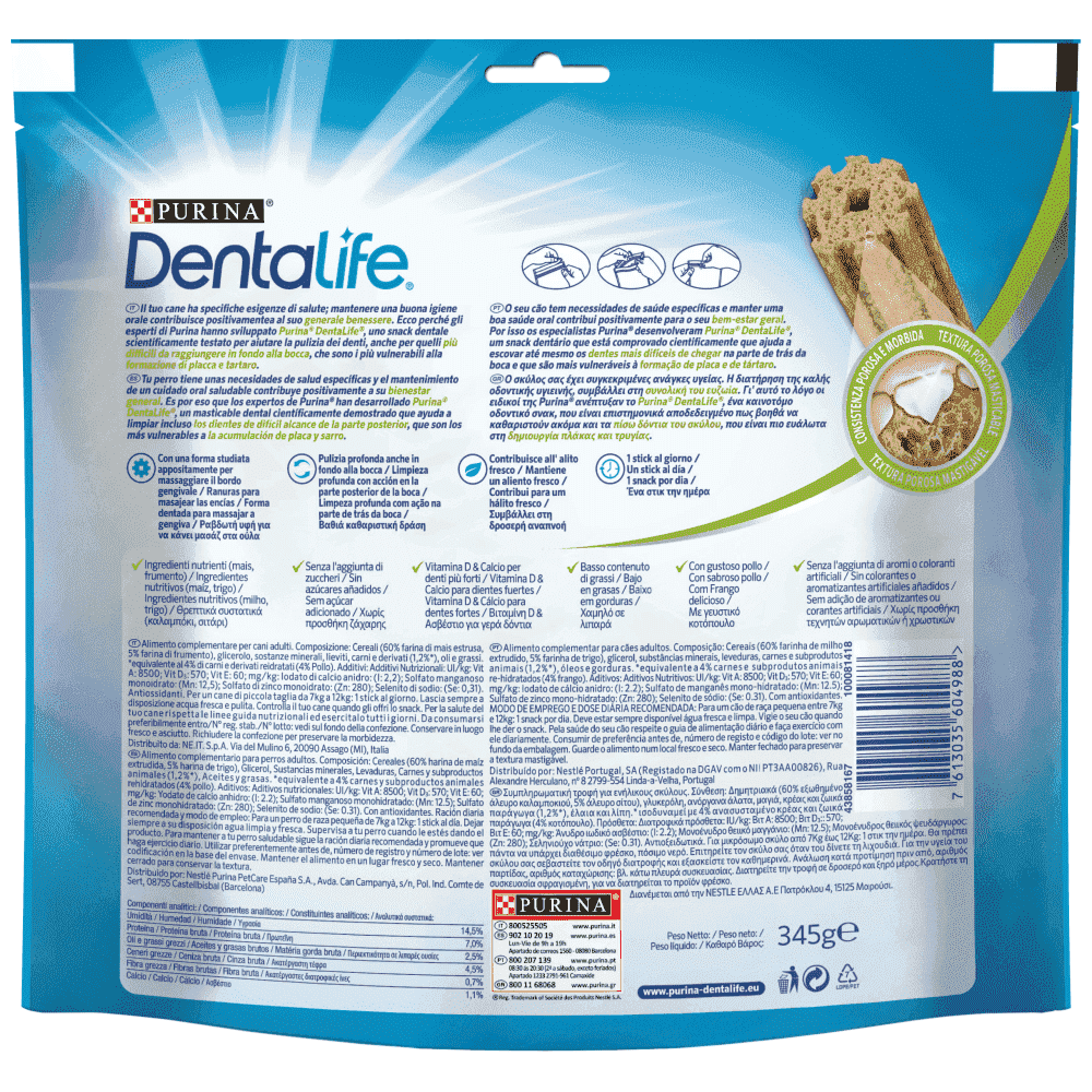Purina DentaLife Καθημερινή οδοντική φροντίδα για μεσαίους σκύλους. Ο σκύλος σας έχει συγκεκριμένες ανάγκες υγείας. Η διατήρηση της καλής οδοντικής υγιεινής, συμβάλει στη συνολική του ευζωία.Γι' αυτό το λόγο οι ειδικοί της Purina ανέπτυξαν το Purina DentaLife, ένα καινοτόμο οδοντικό σνακ για καθημερινή χρήση, που είναι επιστημονικά αποδεδειγμένο πως βοηθά να καθαριστούν ακόμα και τα πίσω δόντια του σκύλου, που είναι πιο ευάλωτα στη δημιουργία πλάκας και τρυγίας.