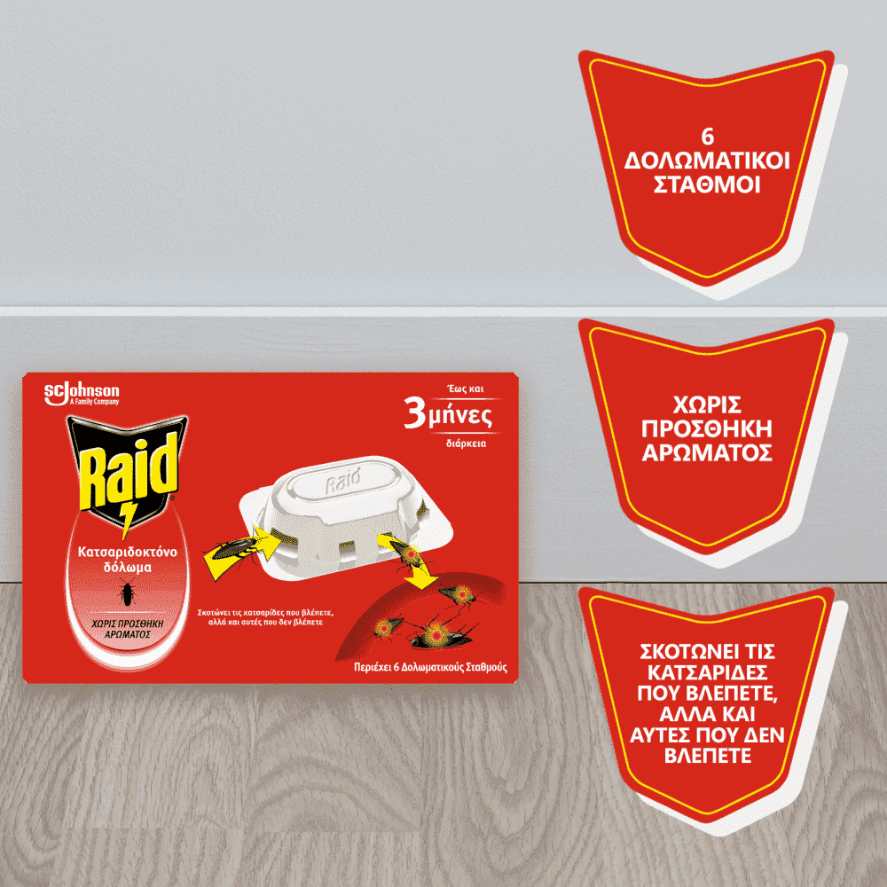 Το Raid Baits σκοτώνει τις κατσαρίδες, τους ωόσακους τους και ολόκληρη την αποικία, για ως και 3 μήνες. Οι κατσαρίδες προσελκύονται από το δόλωμα, το τρώνε και επιστρέφουν στις φωλιές τους, προκαλώντας αλυσιδωτά τον θάνατο της αποικίας.