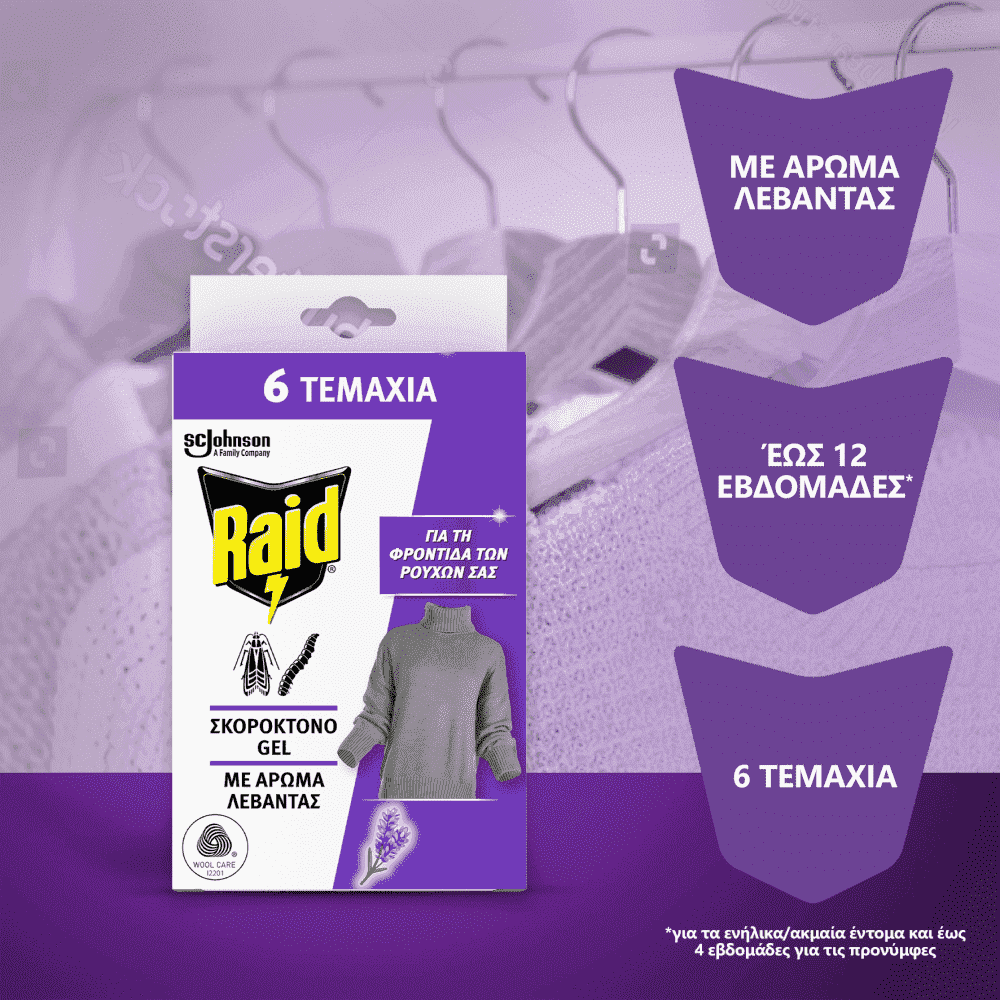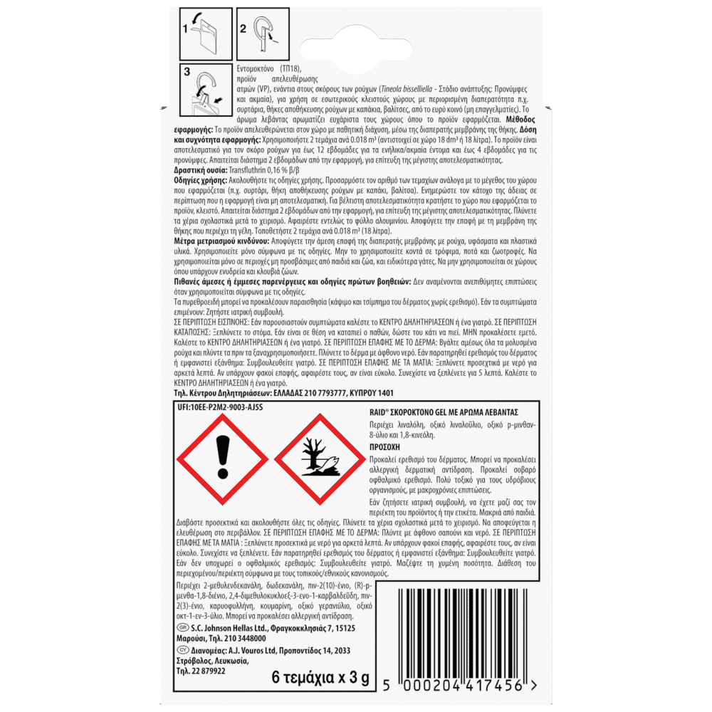Τρόπος εφαρμογής: Αφαιρέστε το φύλλο αλουμινίου τελείως από την πίσω όψη του τεμαχίου. Τοποθετήστε το στην ντουλάπα σας κρεμώντας το από το ειδικό άγκιστρο, ή στο συρτάρι σας ή σε οποιαδήποτε επίπεδη επιφάνεια. Αποφύγετε την άμεση επαφή της διαπερατής μεμβράνης με ρούχα, υφάσματα και πλαστικά υλικά. Συνιστάται να χρησιμοποιείτε 2 τεμάχια σε ντουλάπες διαστάσεων 0,5κ.μ.. Η δραστική ουσία και τo άρωμα με αιθέριο έλαιο λεβάντας, διαχέονται σταδιακά στο χώρο μέσω της ειδικής διαπερατής μεμβράνης. Αντικαταστήστε το προϊόν στο τέλος της σαιζόν ή όταν το gel στεγνώσει και το άρωμα εξασθενήσει. Κρατήστε τις ντουλάπες και τα συρτάρια κλειστά για μέγιστη αποτελεσματικότητα. Σκοτώνει τους σκόρους σε 14 ημέρες.