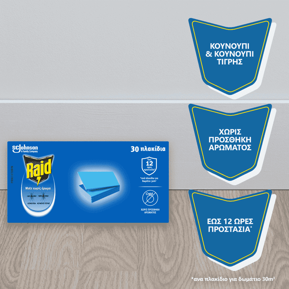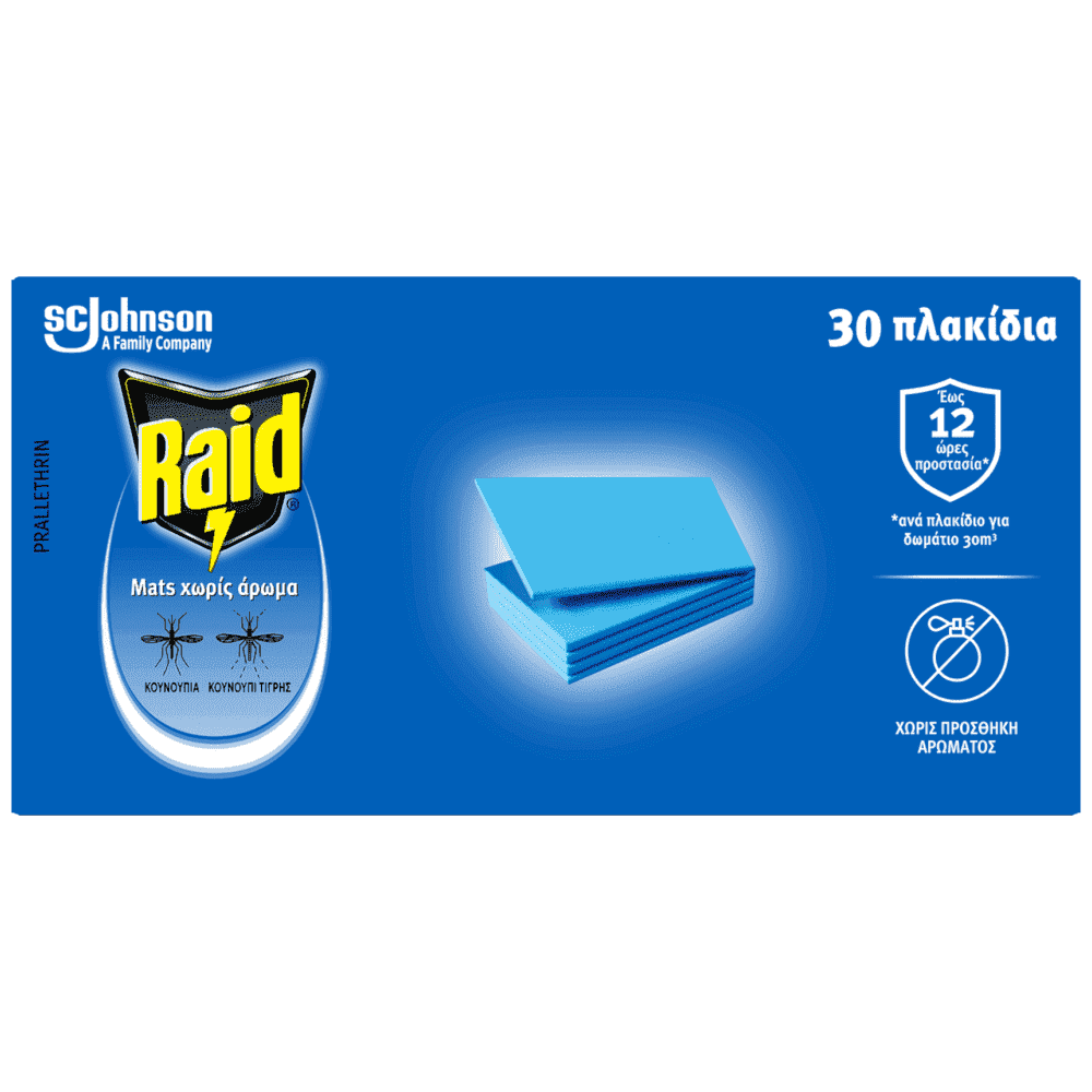 Το RAID MATS ΧΩΡΙΣ ΑΡΩΜΑ είναι ένα εντομοκτόνο για την καταπολέμηση κουνουπιών, συμπεριλαμβανομένων του κουνουπιού τίγρης (Aedes albopictus) και ειδών που συναντώνται σε τροπικές περιοχές (Aedes aegypti, Culex quinquefasciatus), σε μορφή πλακιδίου εξάτμισης (MV), για χρήση μόνο σε κατοικημένους εσωτερικούς χώρους. Χρησιμοποιείται καθ’ όλη τη διάρκεια του έτος και κυρίως κατά τους καλοκαιρινούς μήνες. Ένα πλακίδιο είναι αρκετό για δωμάτιο 30 κυβικών μέτρων για προστασία έως 12 ώρες. Για την εξασφάλιση καλύτερης προστασίας σε μεγαλύτερα δωμάτια, χρησιμοποιήστε περισσότερες συσκευές με πλακίδια.