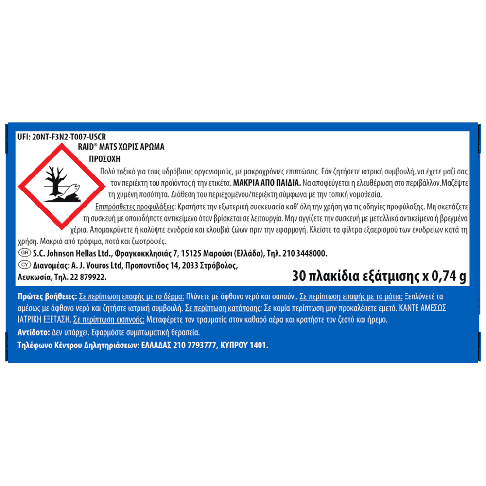 ΠΡΟΣΟΧΗ Πολύ τοξικό για τους υδρόβιους οργανισμούς, με μακροχρόνιες επιπτώσεις. Εάν ζητήσετε ιατρική συμβουλή, να έχετε μαζί σας τον περιέκτη του προϊόντος ή την ετικέτα. ΜΑΚΡΙΑ ΑΠΟ ΠΑΙΔΙΑ. Να αποφεύγεται η ελευθέρωση στο περιβάλλον.Μαζέψτε τη χυμένη ποσότητα. Διάθεση του περιεχομένου/περιέκτη σύμφωνα με την τοπική νομοθεσία. Επιπρόσθετες προφυλάξεις: Κρατήστε την εξωτερική συσκευασία καθ' όλη την χρήση για τις οδηγίες προφύλαξης. Μη σκεπάζετε τη συσκευή με οποιοδήποτε αντικείμενο όταν βρίσκεται σε λειτουργία. Μην αγγίζετε την συσκευή με μεταλλικά αντικείμενα ή βρεγμένα χέρια. Απομακρύνετε ή καλύψτε ενυδρεία και κλουβιά ζώων πριν την εφαρμογή. Κλείστε τα φίλτρα εξαερισμού των ενυδρείων κατά τη χρήση. Μακριά από τρόφιμα, ποτά και ζωοτροφές. (GR) Υπεύθυνος διάθεσης: S.C. JohnsonHellasLtd., Φραγκοκκλησιάς 7, 15125 Μαρούσι (Ελλάδα), τηλ. 210 3448000. (CY) Διανομέας: A. J. VourosLtd, Προποντίδος 14, 2033 Στρόβολος, Λευκωσία