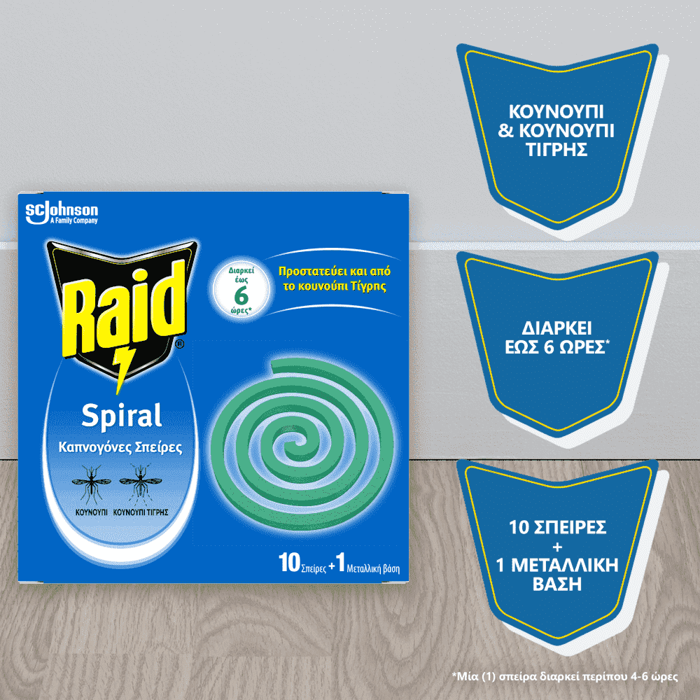 Το Raid Outdoor Spiral, καπνογόνες σπείρες κατά των κουνουπιών, προσφέρει αποτελεσματική προστασία σε εξωτερικούς χώρους όπως κήπους, καταστρώματα σκαφών, κάμπινγκ, μπαλκόνια. Η δράση της σπείρας είναι άμεση λόγω του πεπλατυσμένου άκρου της.