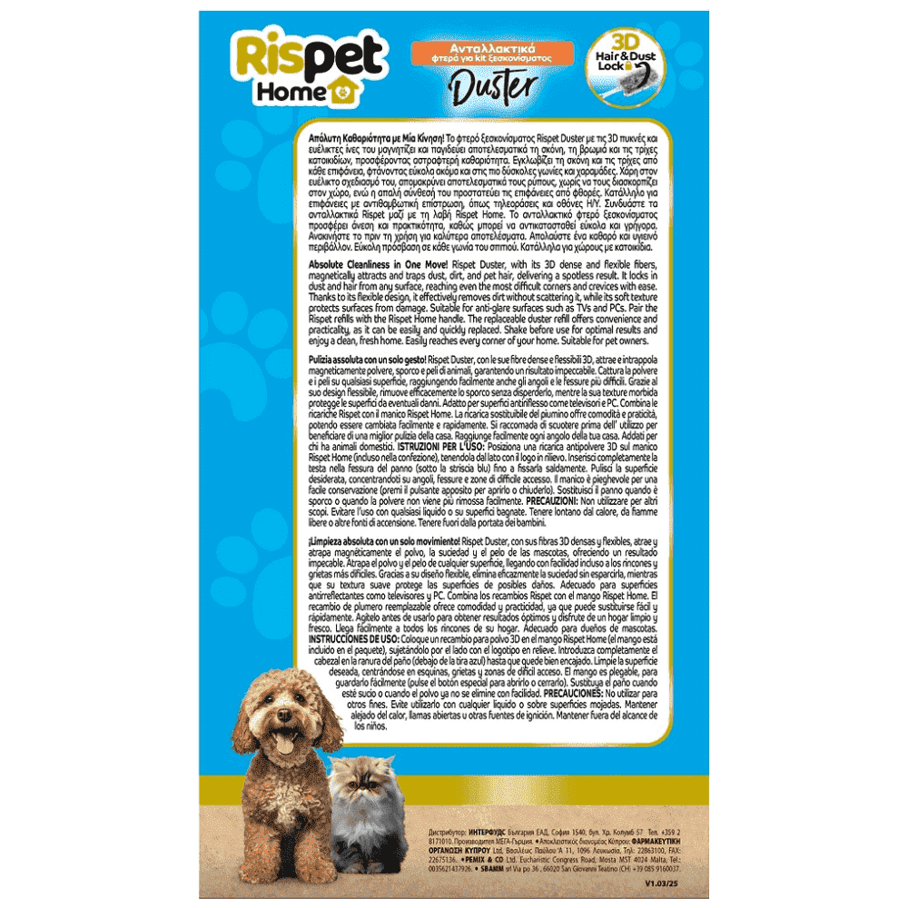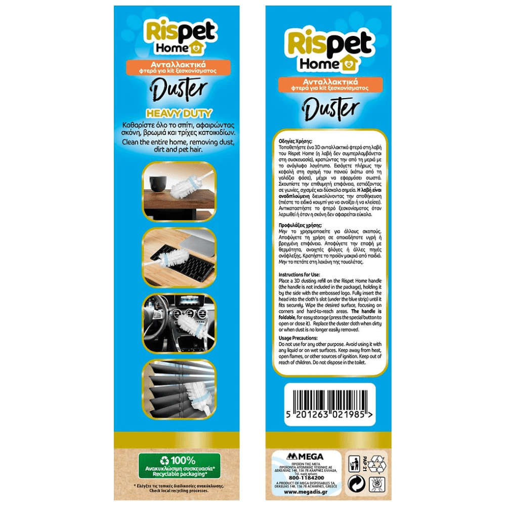 Το φτερό ξεσκονίσματος Rispet με τις 3-D πυκνές και ευέλικτες ίνες του μαγνητίζει και παγιδεύει αποτελεσματικά τη σκόνη, τη βρωμιά και τις τρίχες των κατοικιδίων, προσφέροντας αστραφτερή καθαριότητα. Εγκλωβίζει τη σκόνη και τις τρίχες από κάθε επιφάνεια, φτάνοντας εύκολα ακόμα και στις πιο δύσκολες γωνίες και χαραμάδες. Χάρη στον ευέλικτο σχεδιασμό του, απομακρύνει αποτελεσματικά τους ρύπους, χωρίς να τους διασκορπίζει στο χώρο, ενώ η απαλή σύνθεσή του προστατεύει τις επιφάνειες από φθορές. Συνδυάστε τα ανταλλακτικά Rispet με τη λαβή Rispet Home. Το ανταλλακτικό φτερό ξεσκονίσματος προσφέρει άνεση και πρακτικότητα, καθώς μπορεί να αντικατασταθεί εύκολα και γρήγορα. Ανακινήστε το πριν τη χρήση για καλύτερα αποτελέσματα.Εύκολη πρόσβαση σε κάθε γωνιά του σπιτιού. Κατάλληλα για χώρους με κατοικίδια. Κατάλληλο για επιφάνειες με αντιθομβωτική επίστρωση, όπως τηλεοράσεις και οθόνες Η/Υ. 5 ανταλλακτικά.