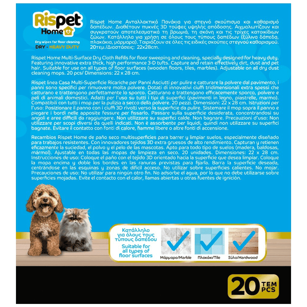 Ανταλλακτικά πανάκια για στεγνό σκούπισμα και καθαρισμό δαπέδων. Διαθέτουν πυκνές 3-D τούφες υψηλής απόδοσης. Αιχμαλωτίζουν και συγκρατούν αποτελεσματικά τη βρωμιά, τη σκόνη και τις τρίχες κατοικίδιων ζώων. Ταιριάζουν σε όλες τις ειδικές σκούπες στεγνού καθαρισμού. Κατάλληλα για χρήση σε όλους τους τύπους δαπέδων (ξύλινα δάπεδα, πλακάκια, μάρμαρα). Διαστάσεις 22x28 cm. Συσκευασία 20 τεμ.