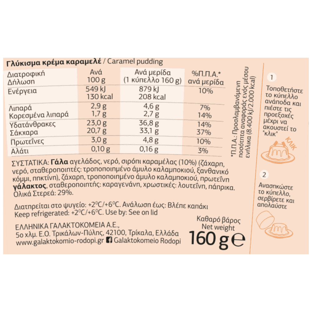Γλύκισμα Κρέμα Καραμελέ, με βελούδινη υφή, πλούσια γεύση και λαχταριστή καραμέλα.Οδηγίες Χρήσης